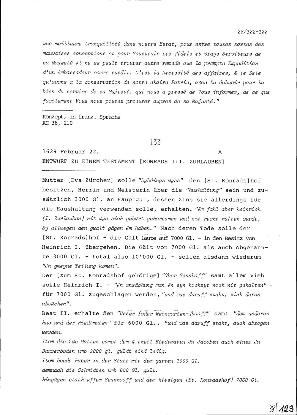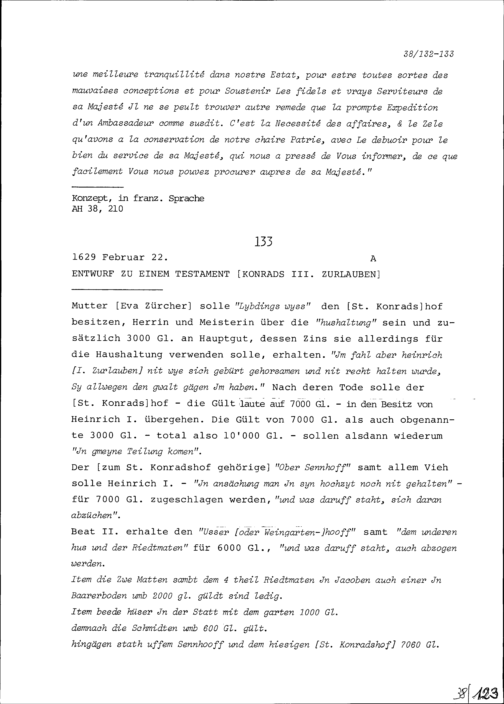Entwurf zu einem Testament von Konrad III. Zurlauben