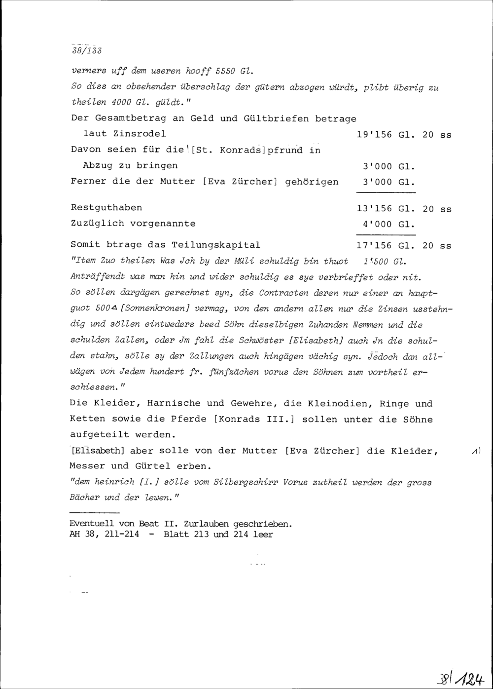 Entwurf zu einem Testament von Konrad III. Zurlauben
