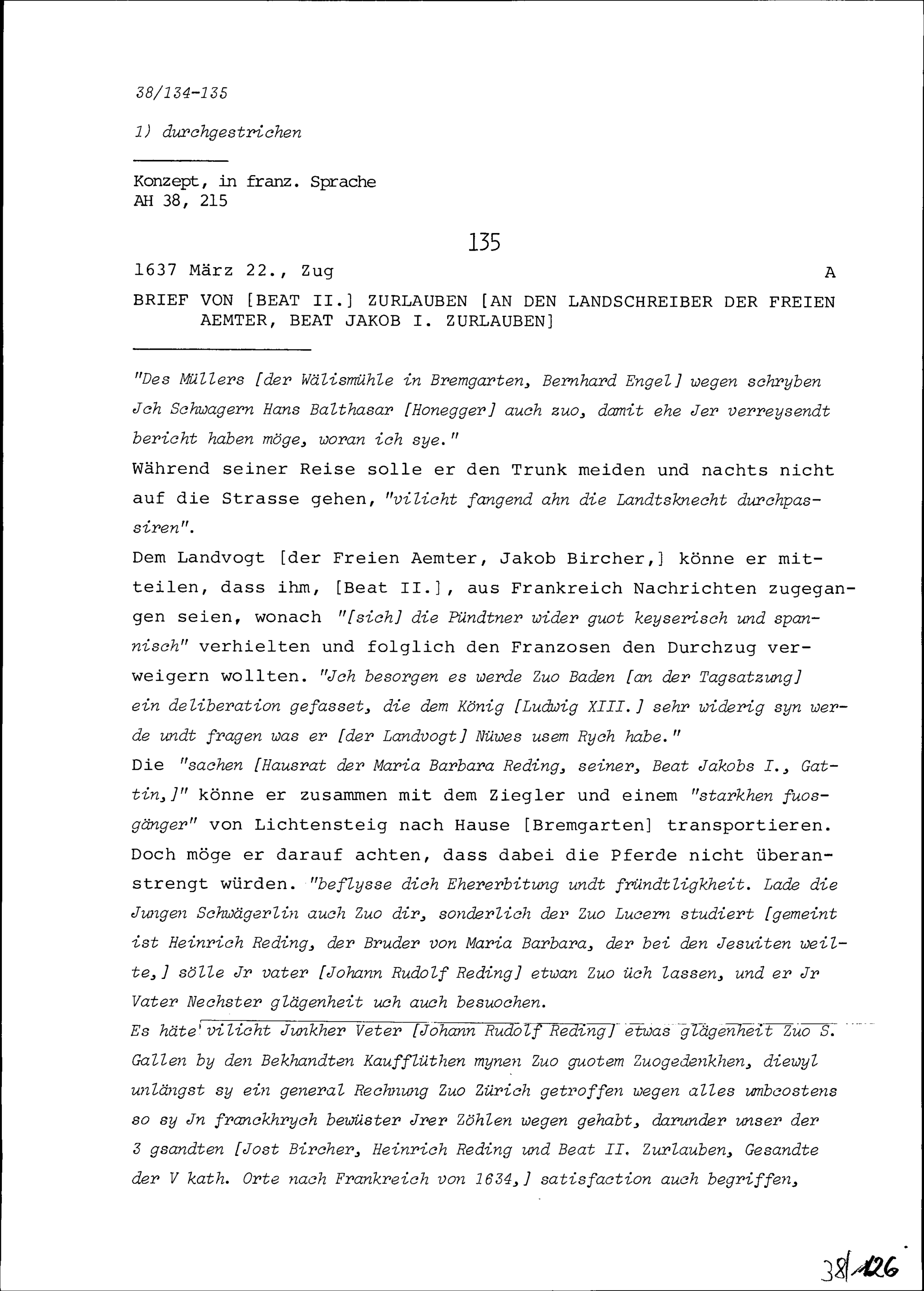 Schreiben von Beat II. Zurlauben an Beat Jakob I. Zurlauben, Landschreiber der Freien Ämter