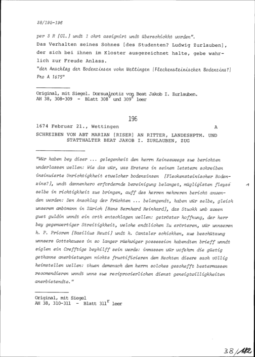 Schreiben von Marian Ryser, Abt, an Beat Jakob I. Zurlauben, Landeshauptmann und Statthalter, Zug