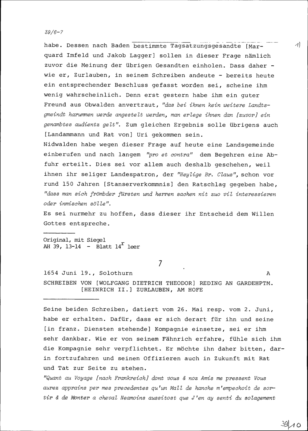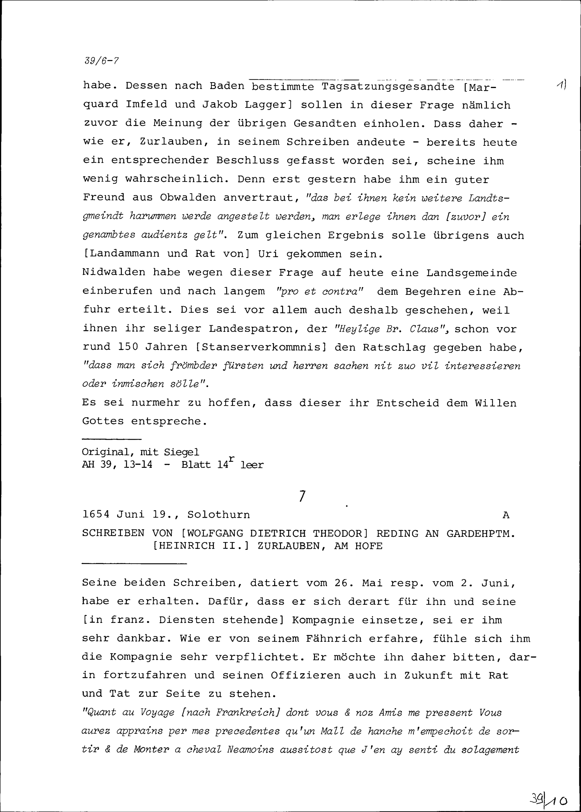 Schreiben von Wolfgang Dietrich Theodor Reding an Heinrich II. Zurlauben, Gardehauptmann, am Hof in Paris