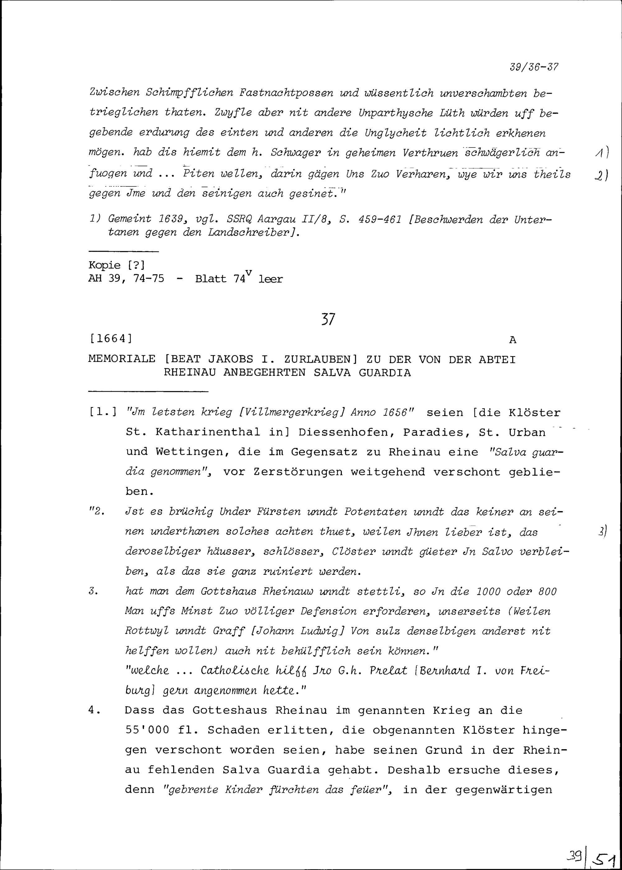 Bericht von Beat Jakob I. Zurlauben zu der von der Abtei Rheinau anbegehrten Salva guardia