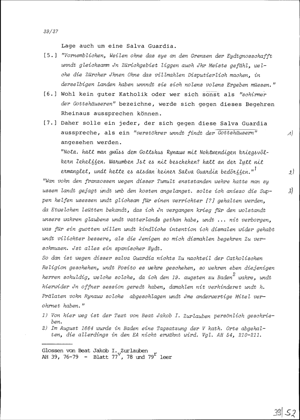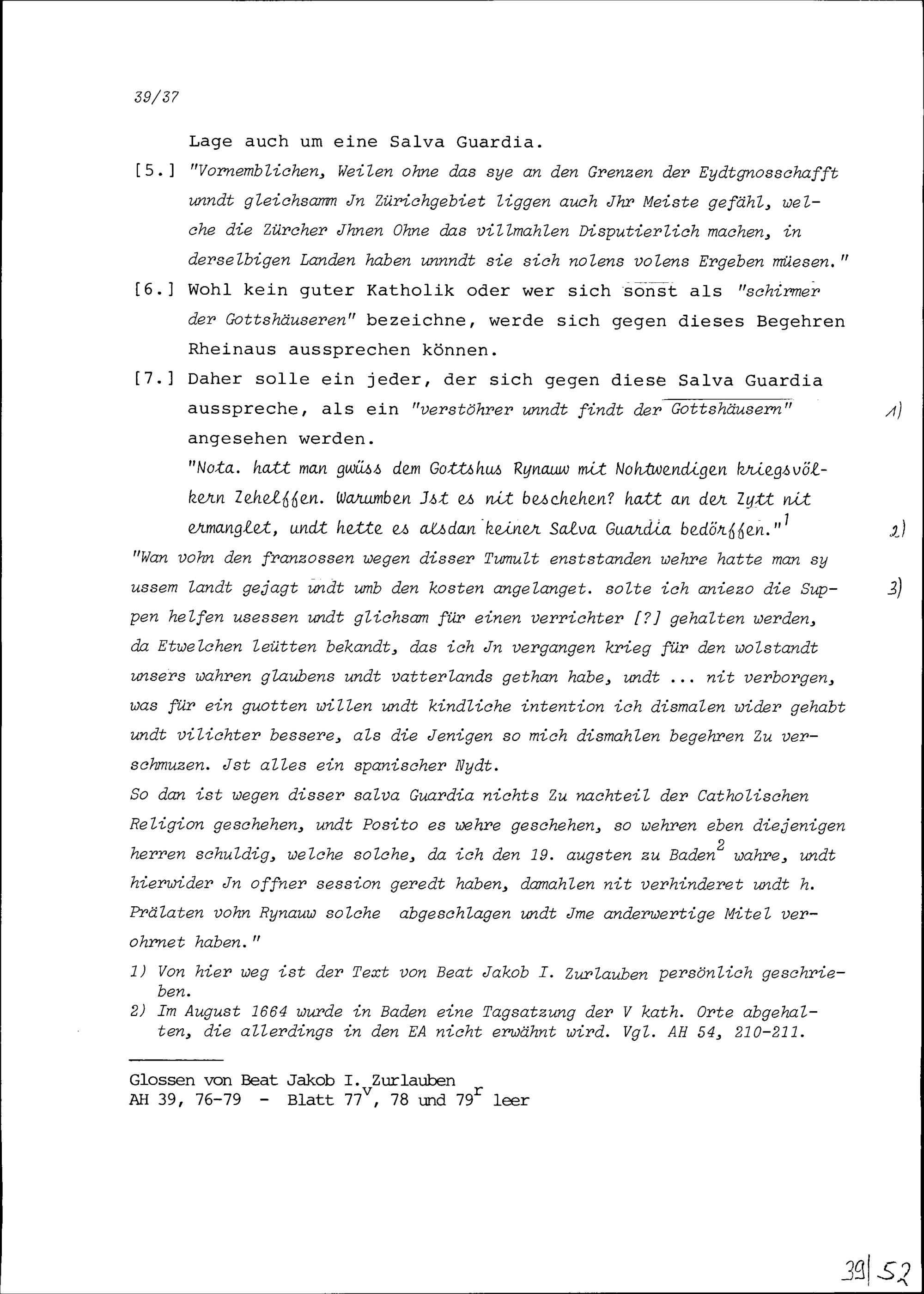 Bericht von Beat Jakob I. Zurlauben zu der von der Abtei Rheinau anbegehrten Salva guardia