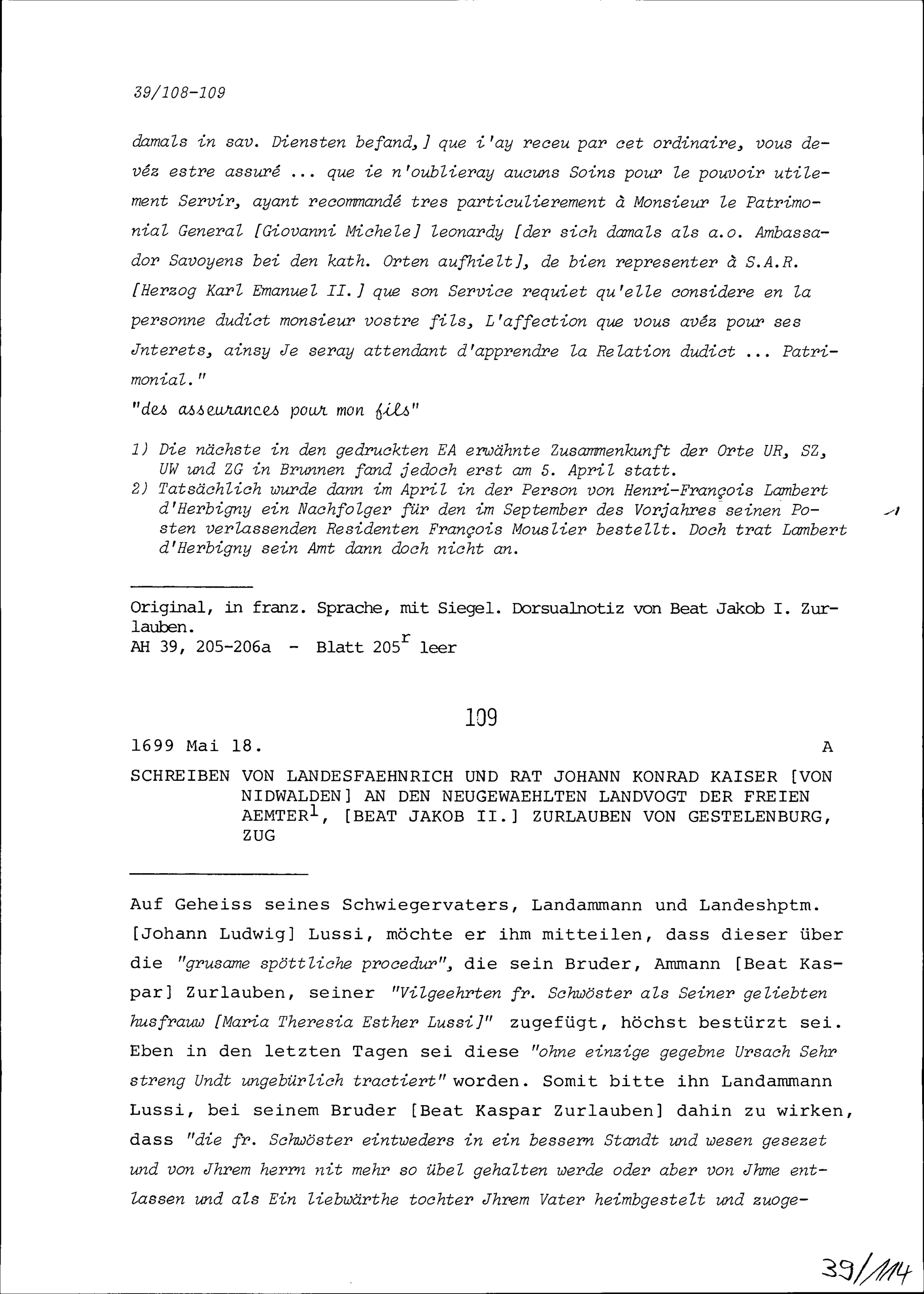 Schreiben Nidwaldens an Beat Jakob II. Zurlauben, neugewählter Landvogt der Freien Ämter Zug