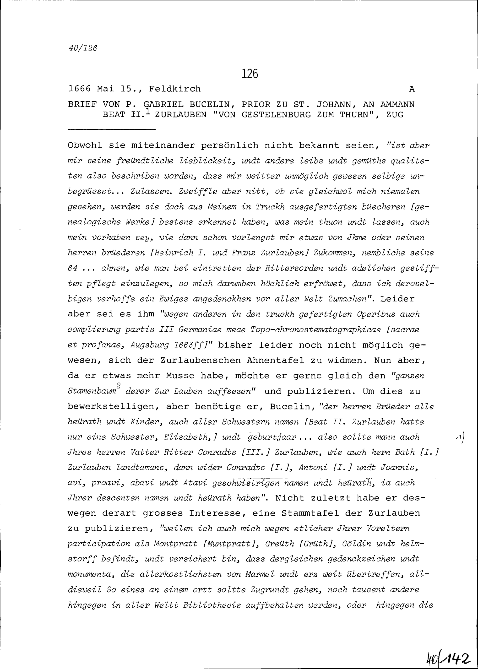 Schreiben von Gabriel Bucelin (eigentlich Gabriel Buzlin, pseudonym auch Gerhardus Belga), Prior zu Sankt Johann, an Beat II. Zurlauben, Ammann, Zug