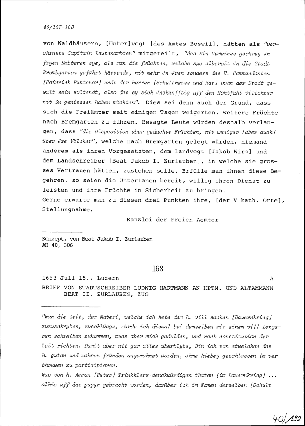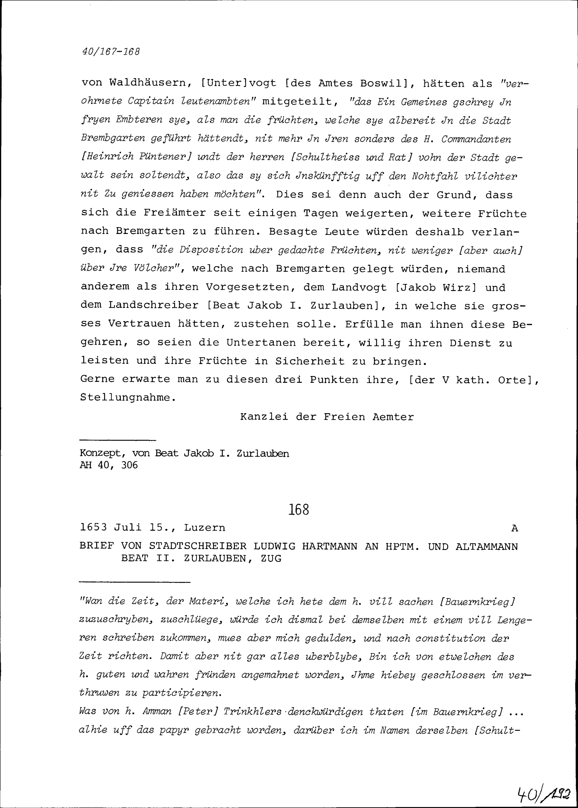 Schreiben von Ludwig Hartmann, Stadtschreiber, an Beat II. Zurlauben, Hauptmann und Altammann, Zug