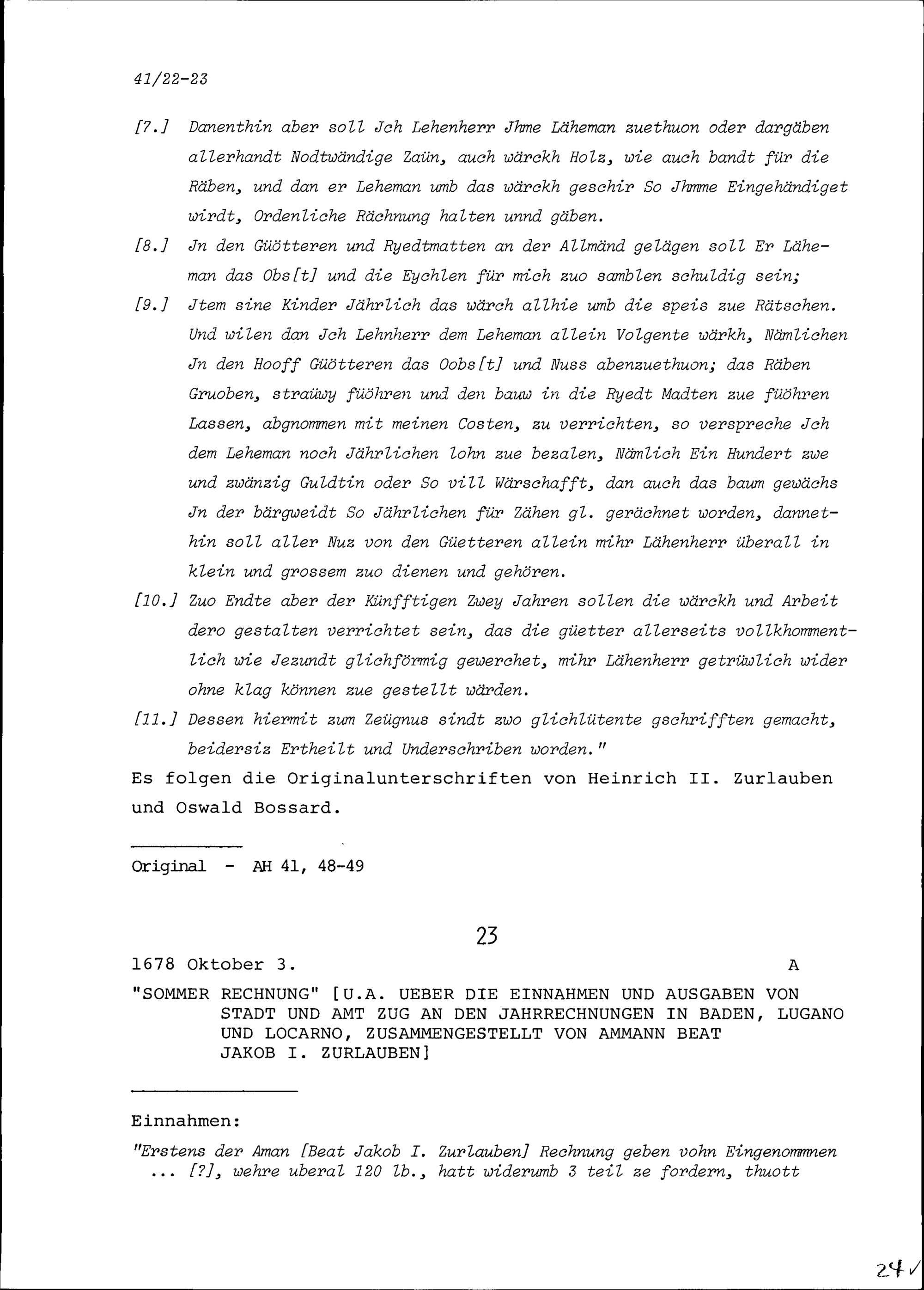 Sommerrechnung unter anderem über die Einnahmen und Ausgaben von Stadt und Amt Zug an den Jahrrechnungen in Baden, Lugano und Locarno, zusammengestellt von Beat Jakob I. Zurlauben, Ammann