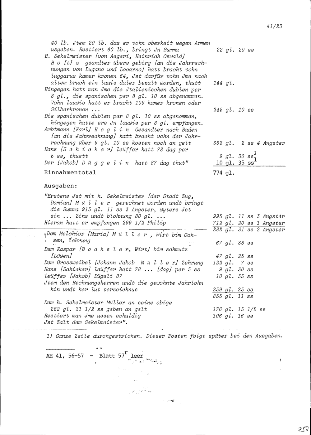 Sommerrechnung unter anderem über die Einnahmen und Ausgaben von Stadt und Amt Zug...