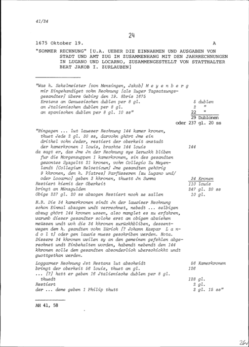 Sommerrechnung unter anderem über die Einnahmen und Ausgaben von Stadt und Amt Zug in Zusammenhang mit den Jahrrechnungen in Lugano und Locarno, zusammengestellt von Beat Jakob I. Zurlauben, Statthalter