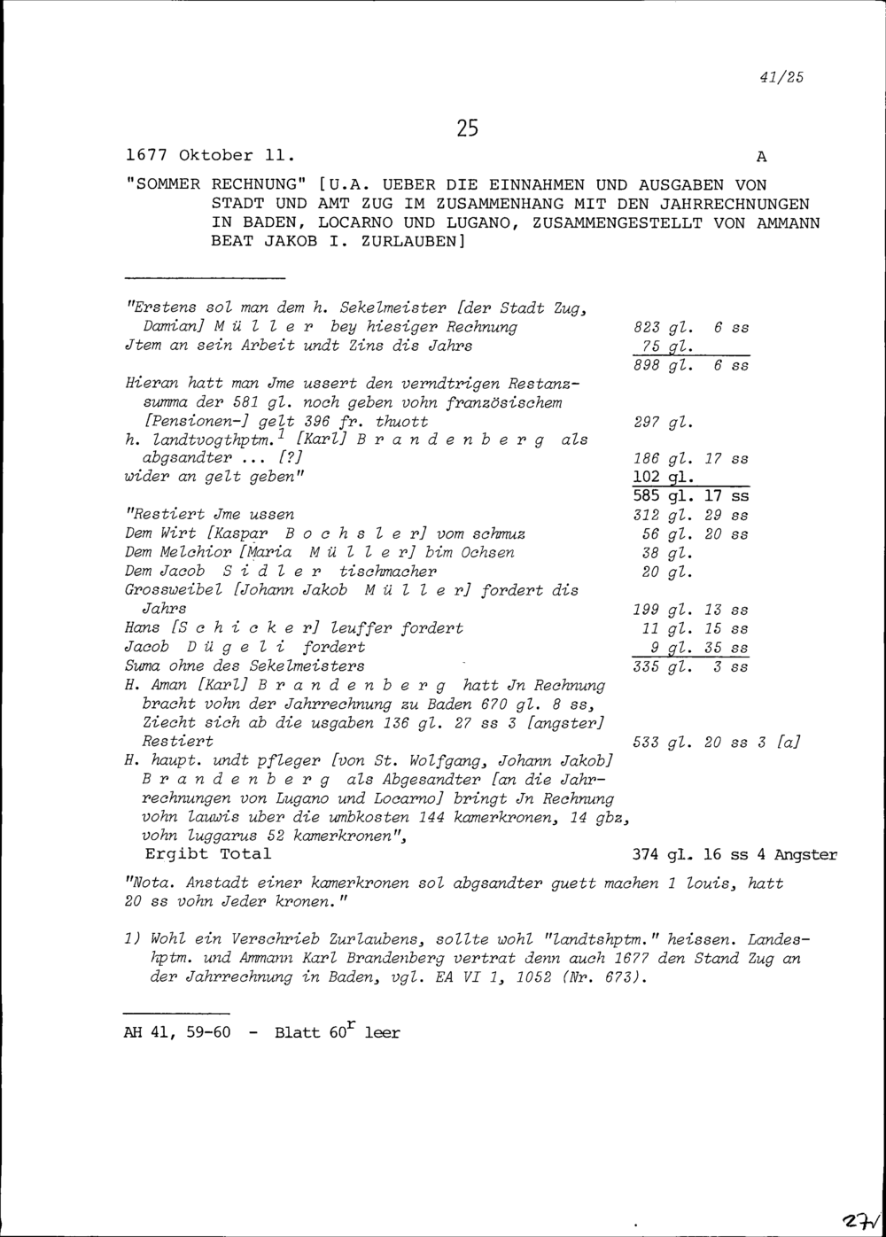 Sommerrechnung unter anderem über die Einnahmen und Ausgaben von Stadt und Amt Zug in Zusammenhang mit den Jahrrechnungen in Baden, Locarno und Lugano, zusammengestellt von Beat Jakob I. Zurlauben, Ammann