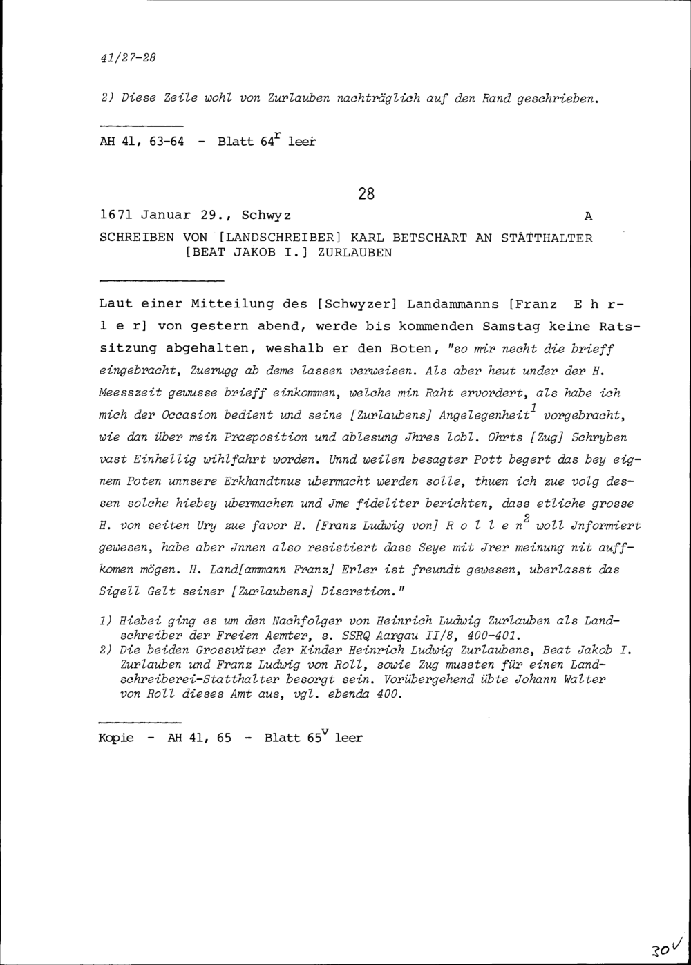 Schreiben von Karl Betschart, Landschreiber, an Beat Jakob I. Zurlauben, Statthalter