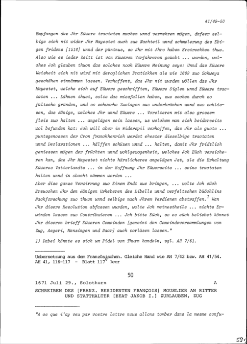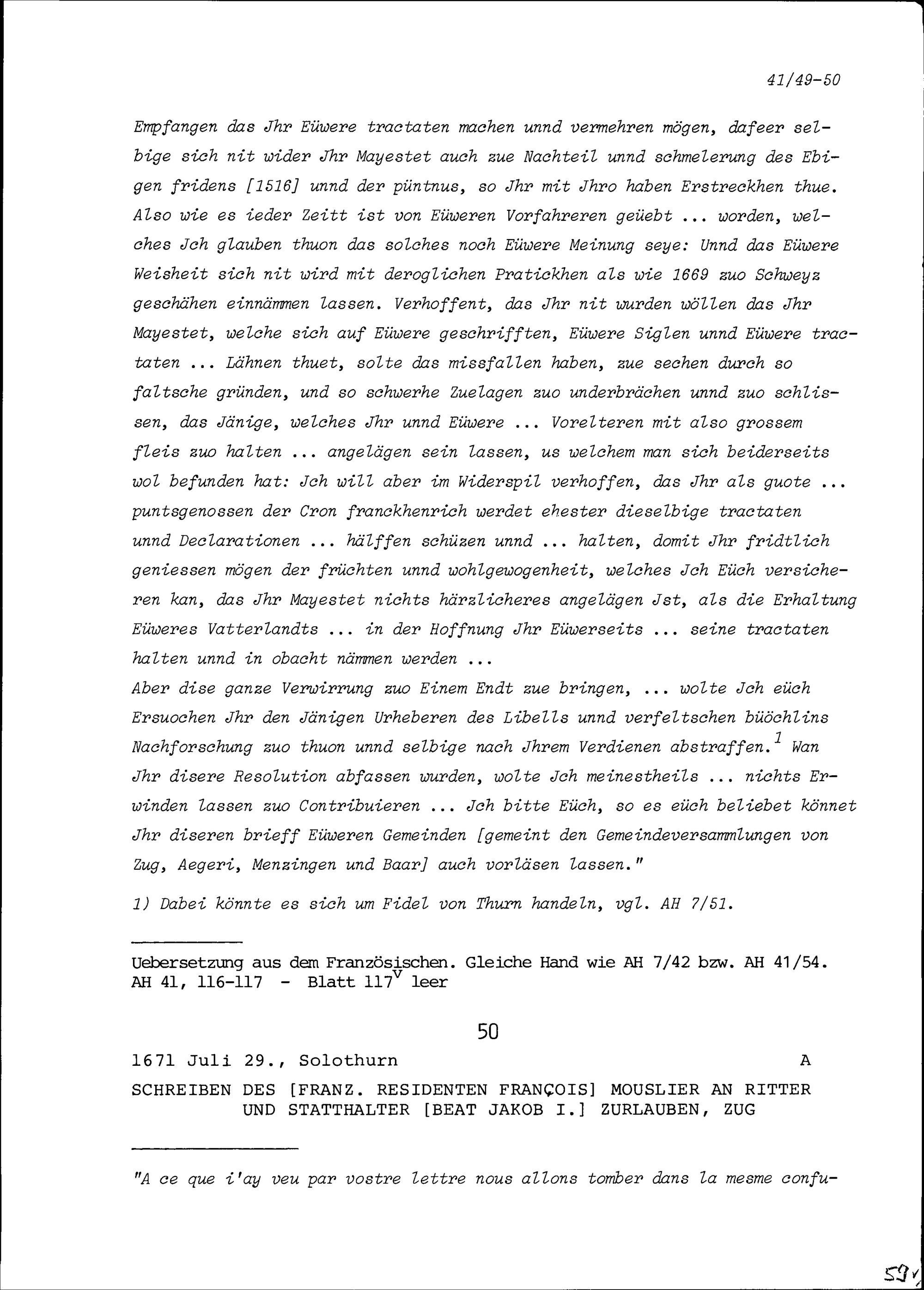 Schreiben von François Mouslier, Resident von Frankreich, an Beat Jakob I. Zurlauben, Statthalter, Zug