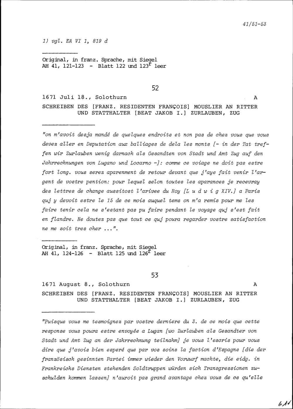 Schreiben von François Mouslier, Resident von Frankreich, an Beat Jakob I. Zurlauben, Statthalter, Zug