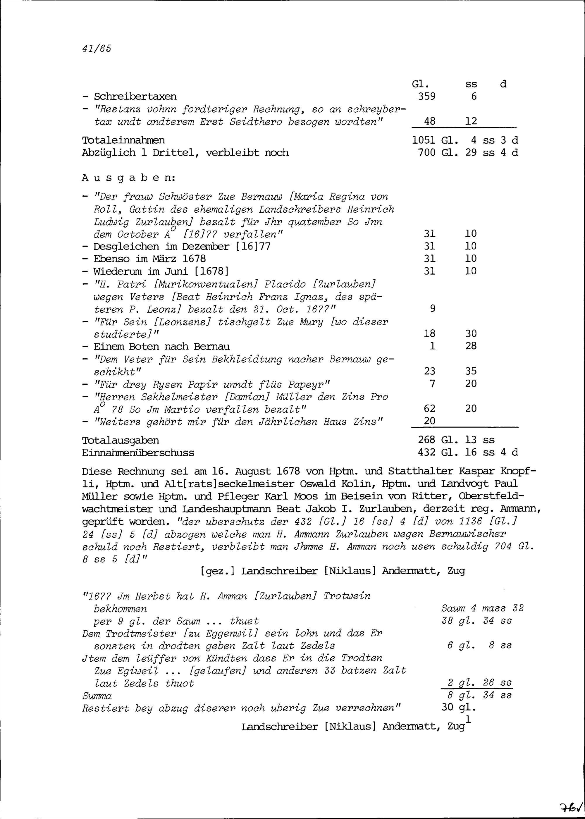 Rechnung der Landschreiberei der Freien Ämter vom Johannestag 1677 bis zum Johannestag 1678, zusammengestellt von Beat Kaspar Zurlauben, Landschreiber