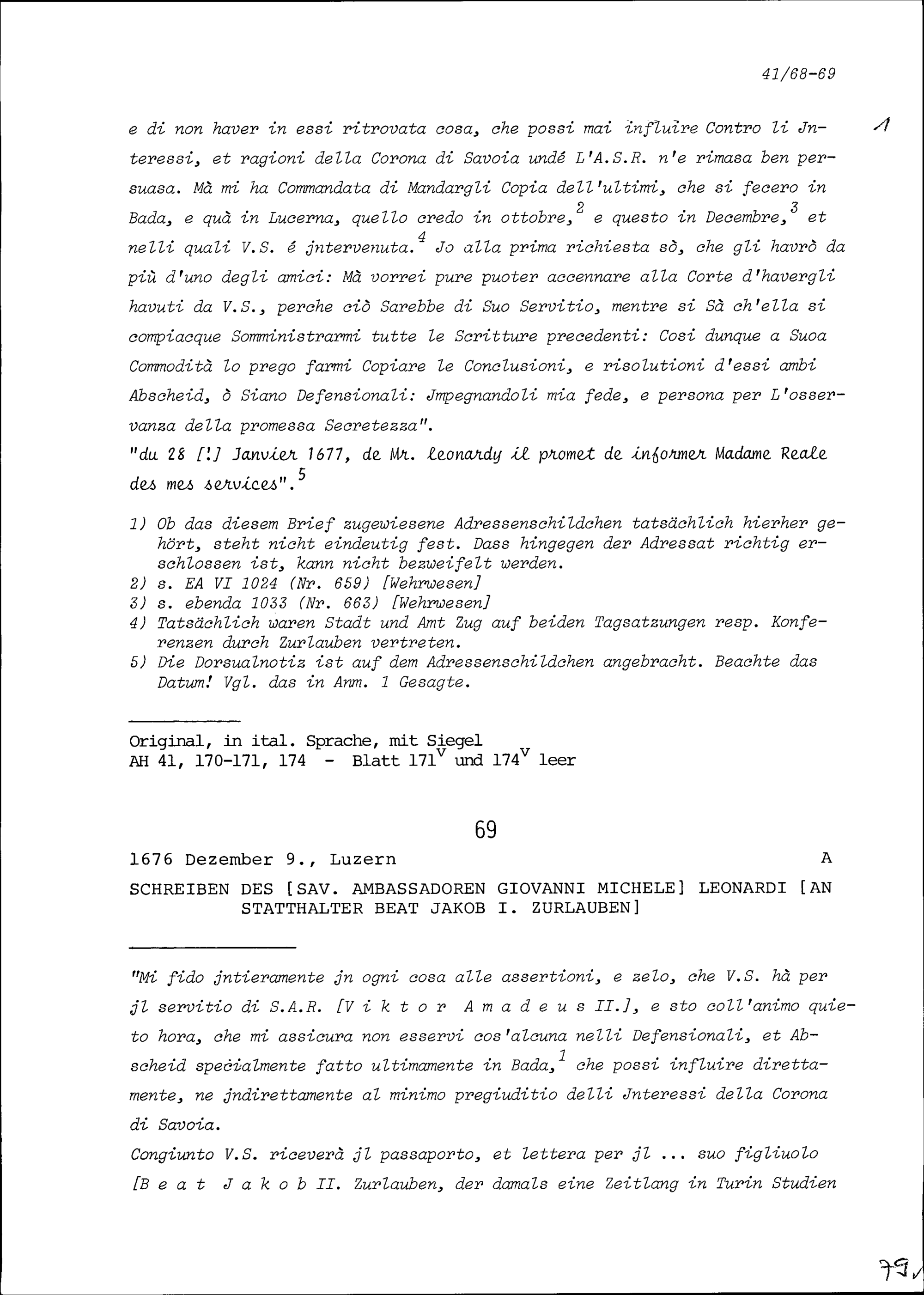 Schreiben von Giovanni Michele Leonardi, Ambassador von Savoyen, an Beat Jakob I. Zurlauben, Statthalter