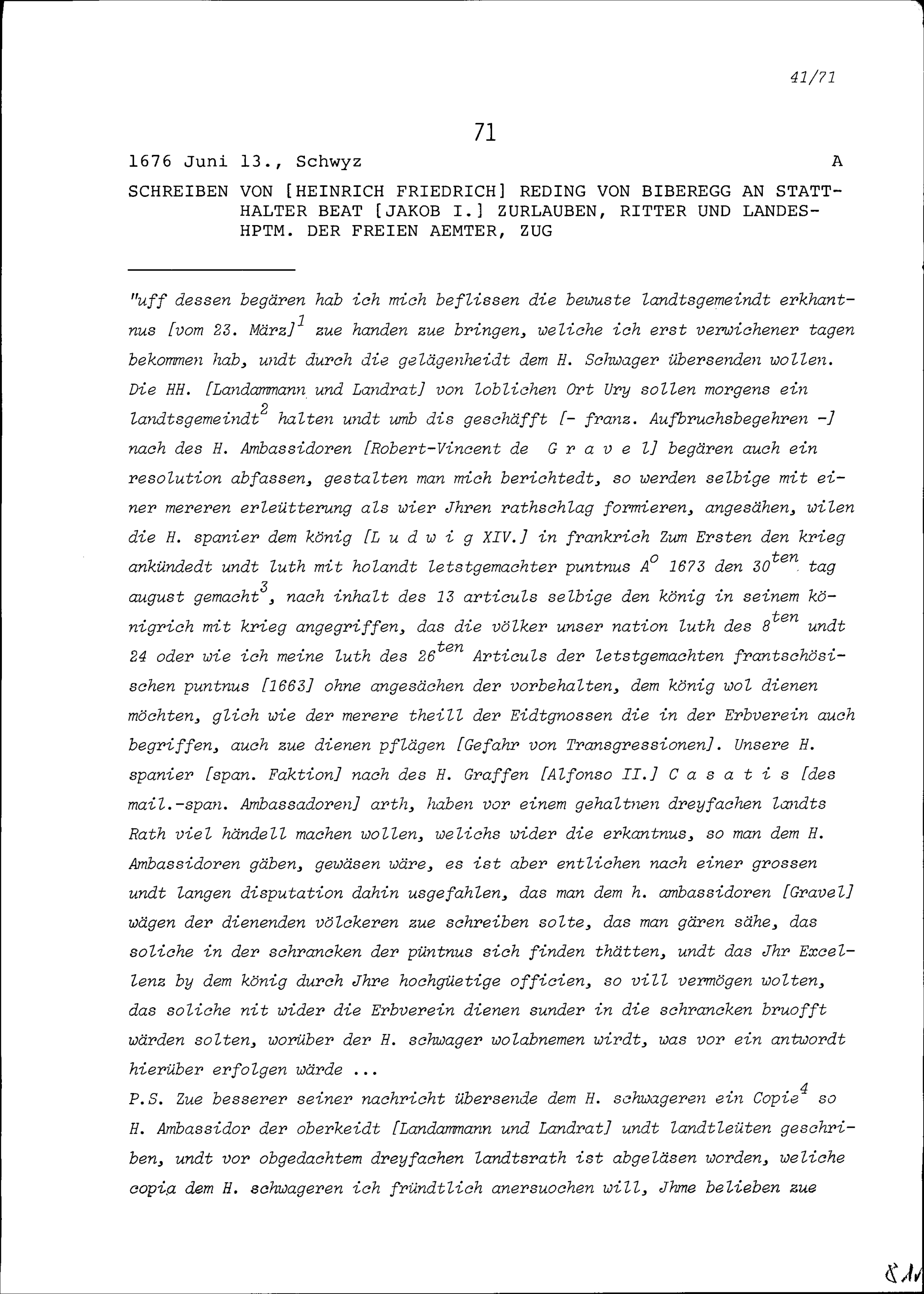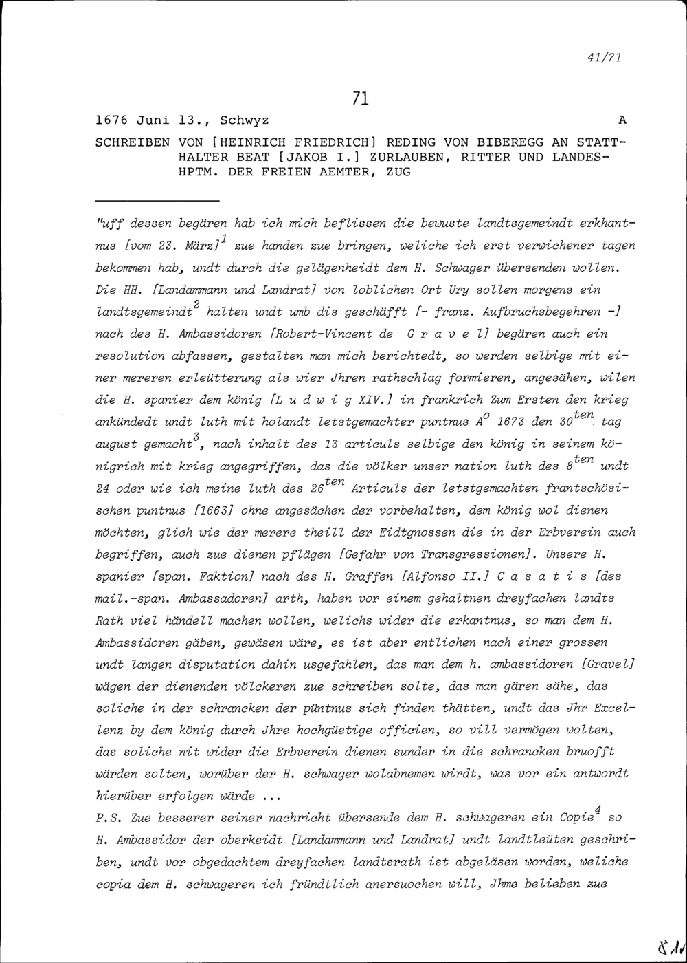 Schreiben von Heinrich Friedrich Reding von Biberegg an Beat Jakob I. Zurlauben, Statthalter, Landeshauptmann der Freien Ämter, Zug