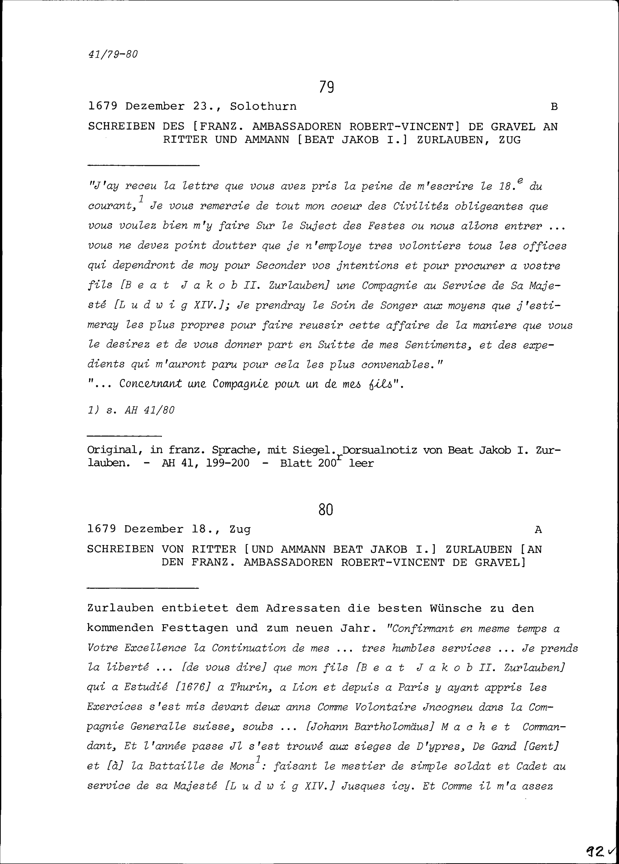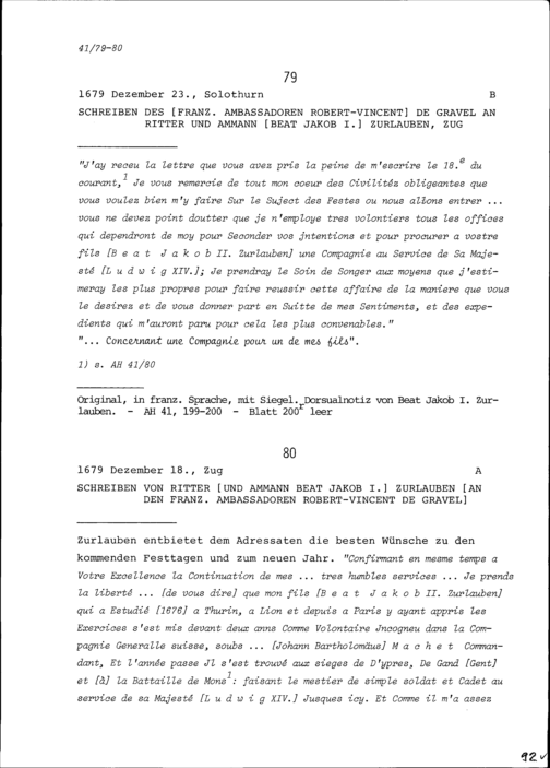 Schreiben von Robert-Vincent de Gravel, Ambassador von Frankreich, an Beat Jakob I. Zurlauben, Ammann, Zug