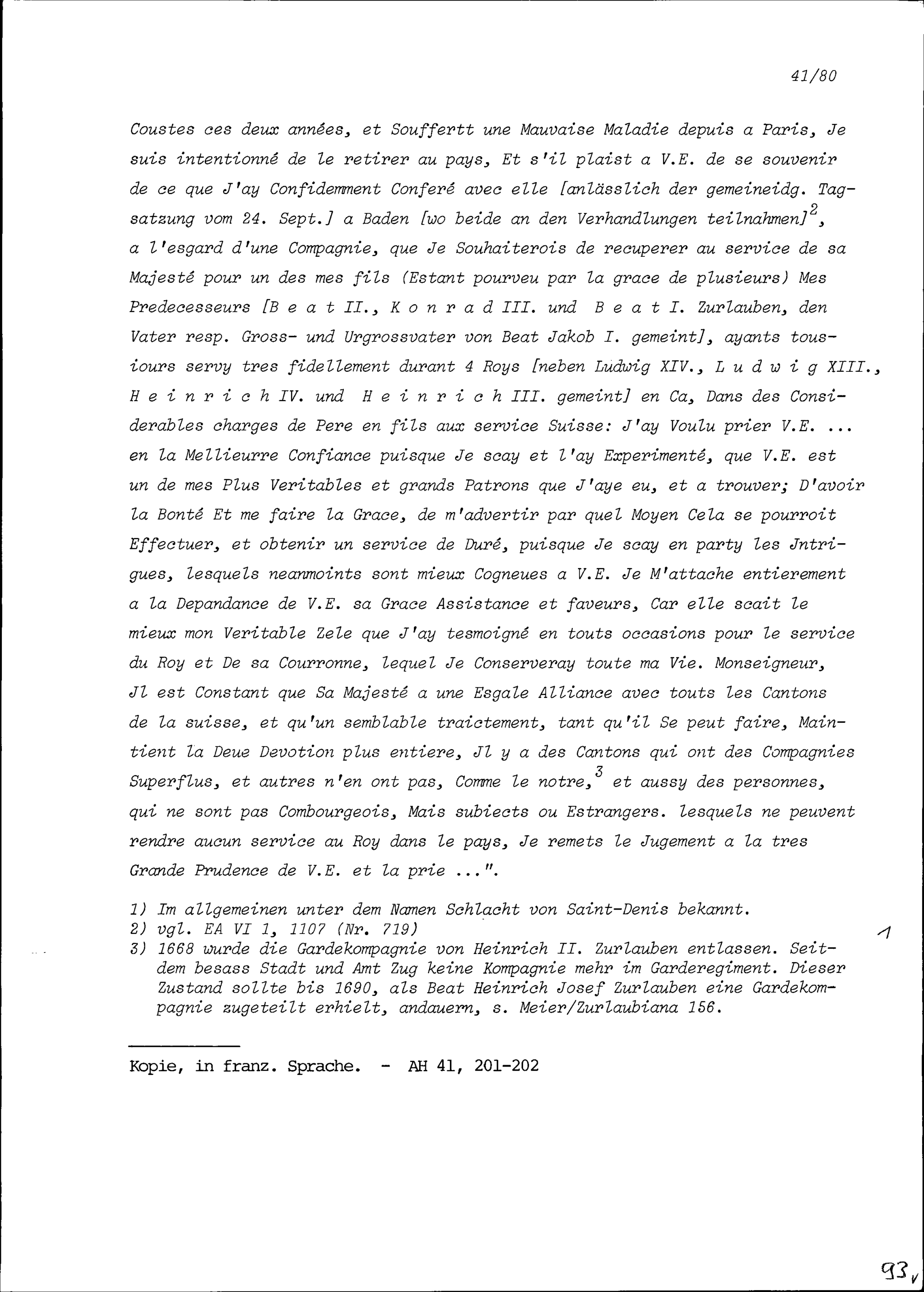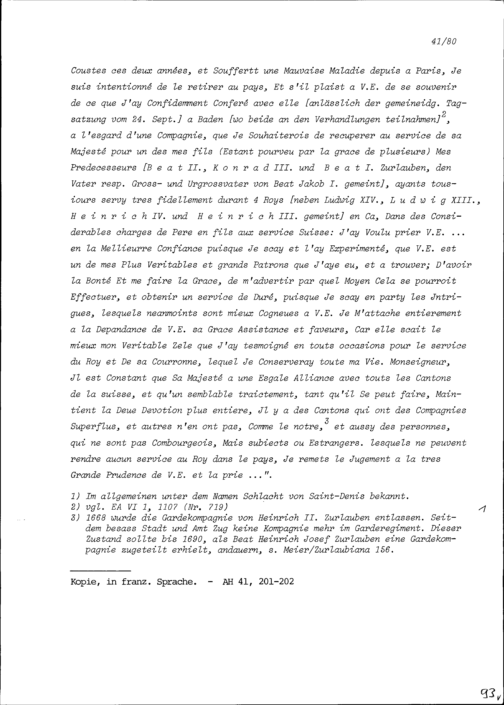 Schreiben von Beat Jakob I. Zurlauben, Ammann, an Robert-Vincent de Gravel, Ambassador von Frankreich