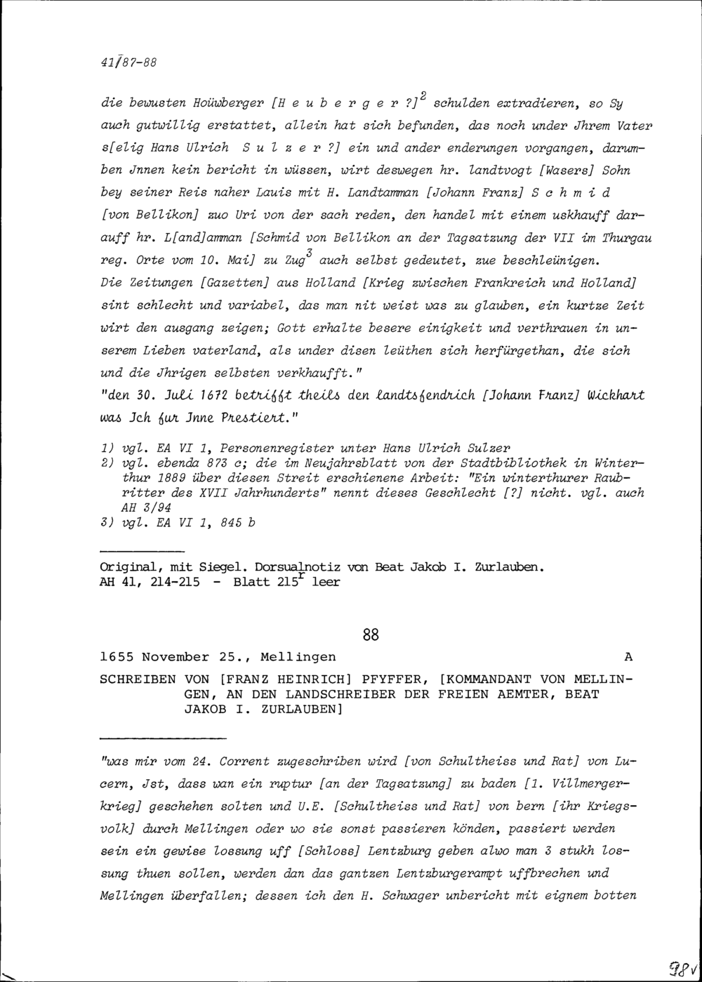 Schreiben von Franz Heinrich Pfyffer, Kommandant von Mellingen, an Beat Jakob I....