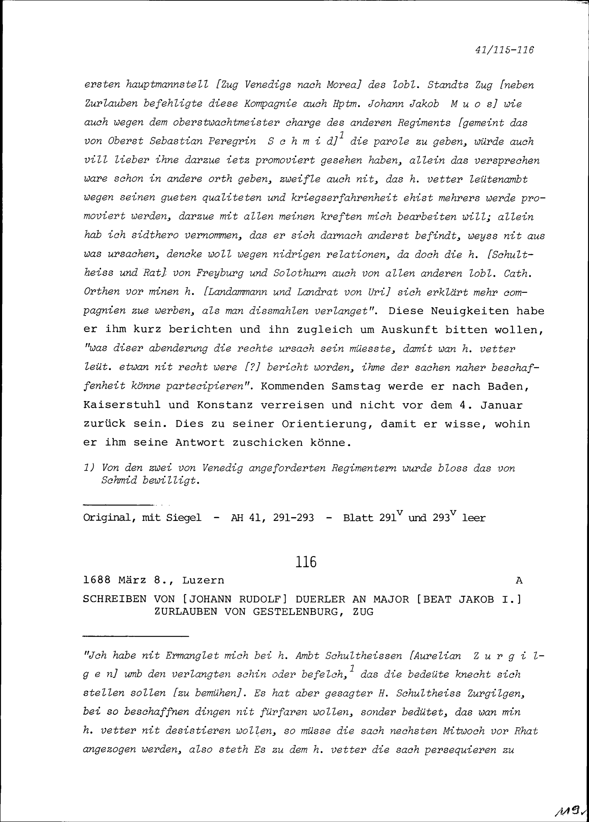 Schreiben von Johann Rudolf Dürler an Beat Jakob I. Zurlauben, Major und Zug