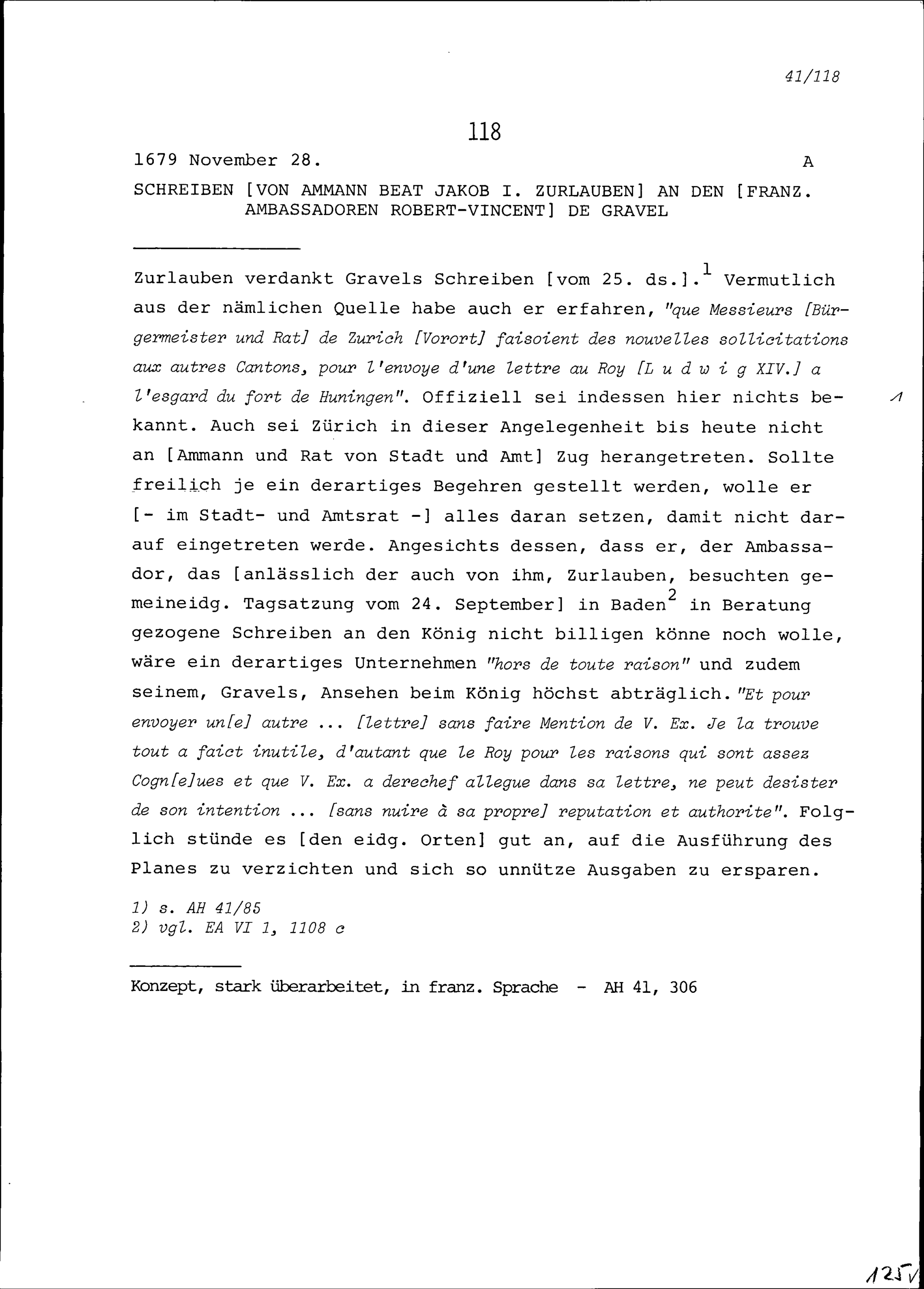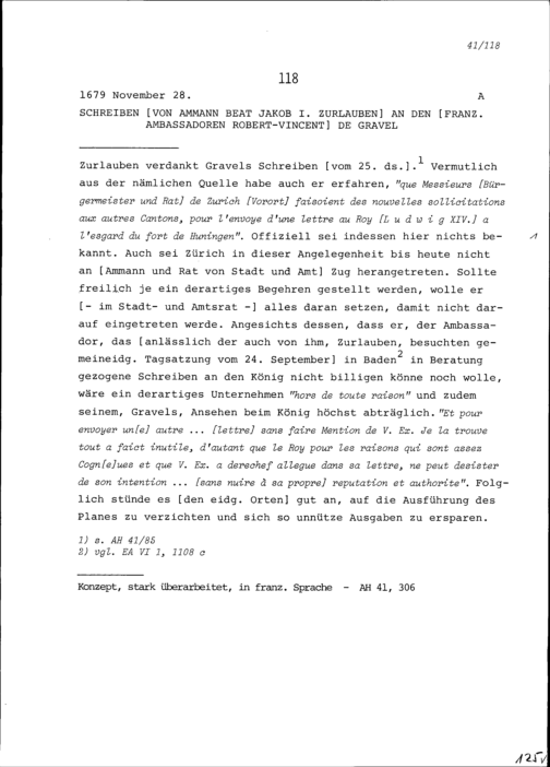 Schreiben von Beat Jakob I. Zurlauben, Ammann, an Robert-Vincent de Gravel, Ambassador von Frankreich
