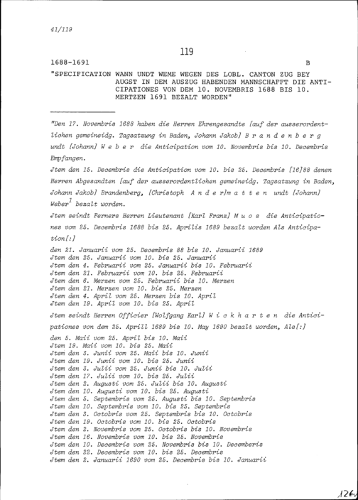 Soldliste für die Truppe, die bei Äugst vom 10. November 1688 bis 10. März 1691 Dienst...
