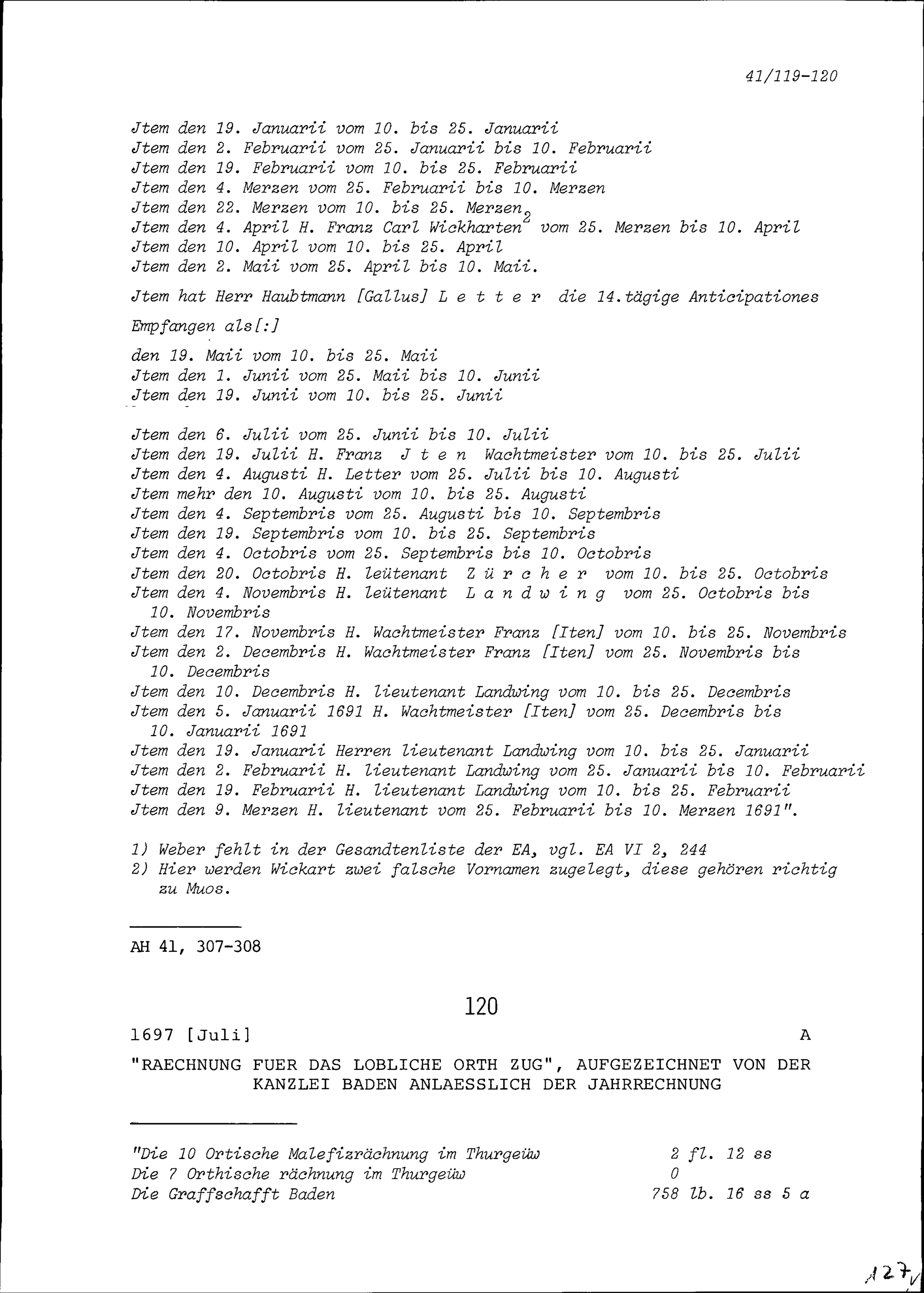 Rechnung für Zug, aufgezeichnet von der Kanzlei in Baden anlässlich der Jahrrechnung