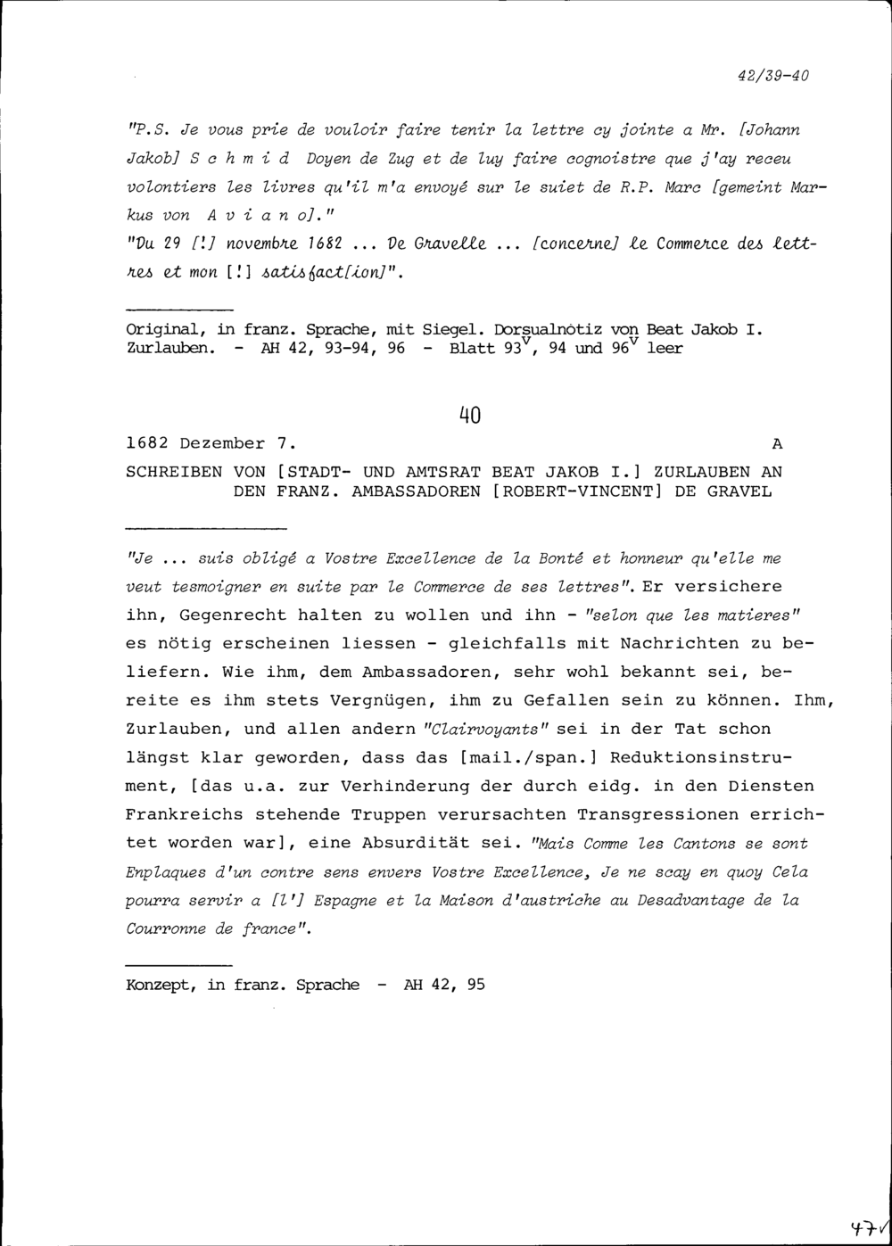 Schreiben von Beat Jakob I. Zurlauben, Stadt- und Amtrat, an Robert-Vincent de Gravel, Ambassador von Frankreich