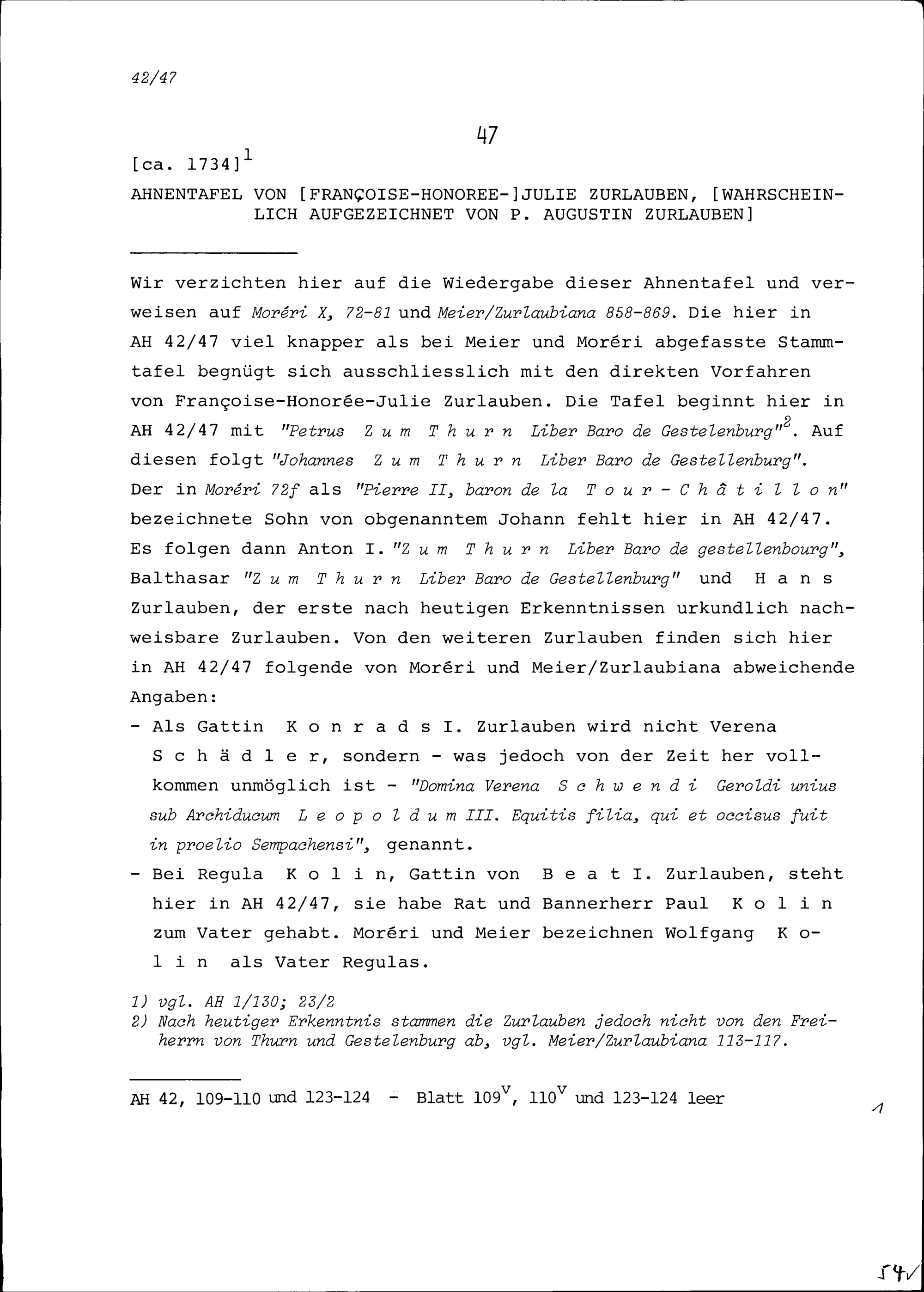 Ahnentafel von Françoise-Honorée-Julie Zurlauben, wahrscheinlich aufgezeichnet von Augustin Zurlauben, Benediktinerpater der Abtei Rheinau