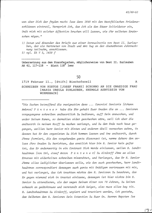 Schreiben von Josef Franz Schorno, Kustos, an Maria Ursula Zurlauben, Klosterfrau...