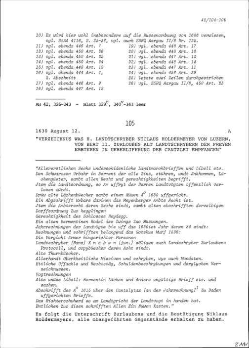 Verzeichnis dessen, was Niklaus Holdermeyer, Landschreiber, von Luzern, von Beat II. Zurlauben, Altlandschreiber der Freien Ämter, auf der Kanzlei empfangen hat