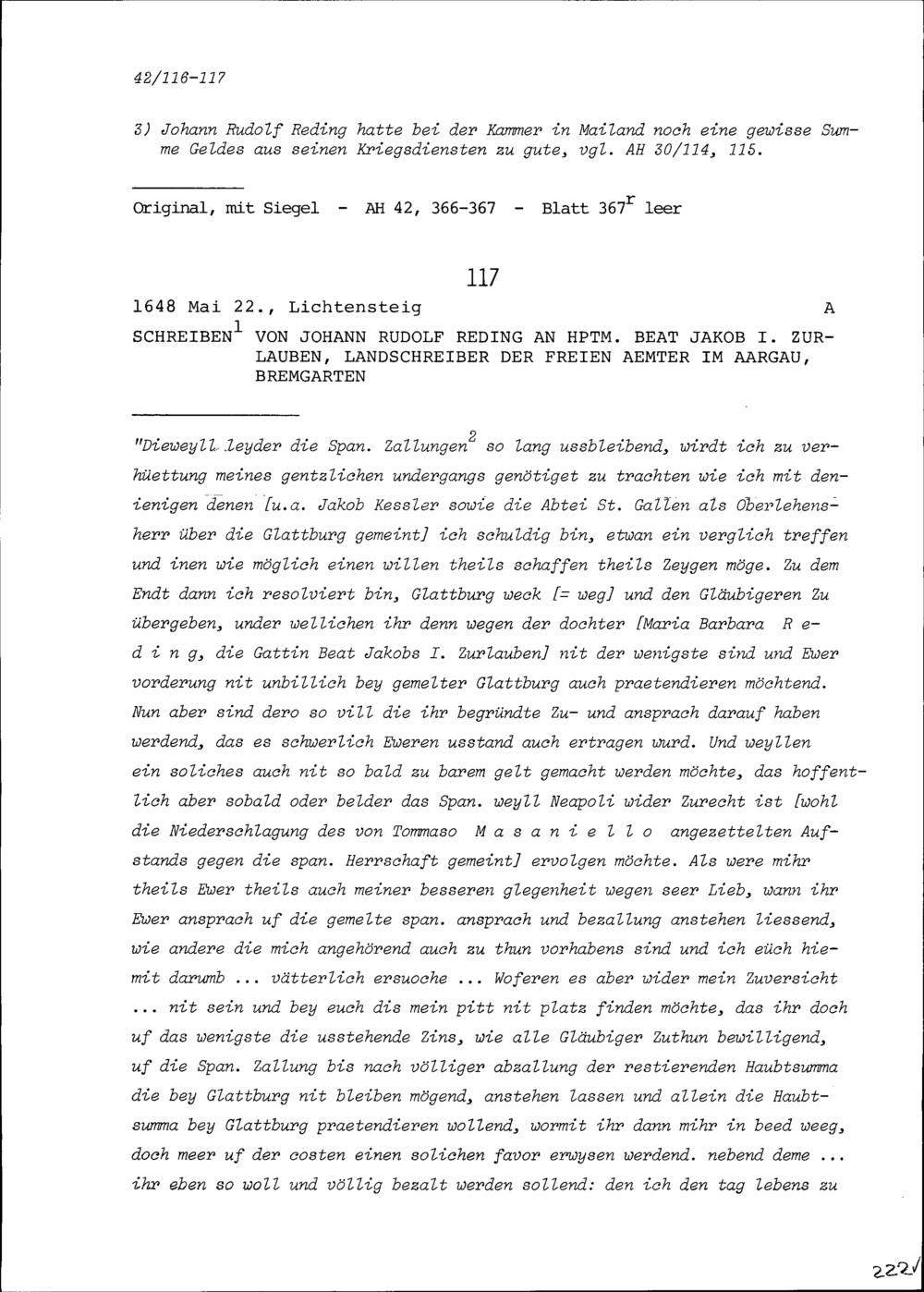 Schreiben von Johann Rudolf Reding an Beat Jakob I. Zurlauben, Hauptmann und Landschreiber der Freien Ämter, Bremgarten