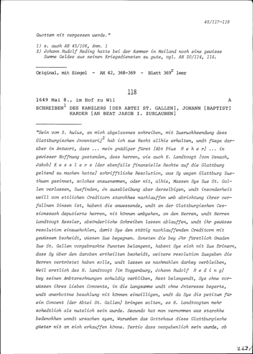 Schreiben von Johann Baptist Härder, Kanzler der Abtei Sankt Gallen, an Beat Jakob I. Zurlauben
