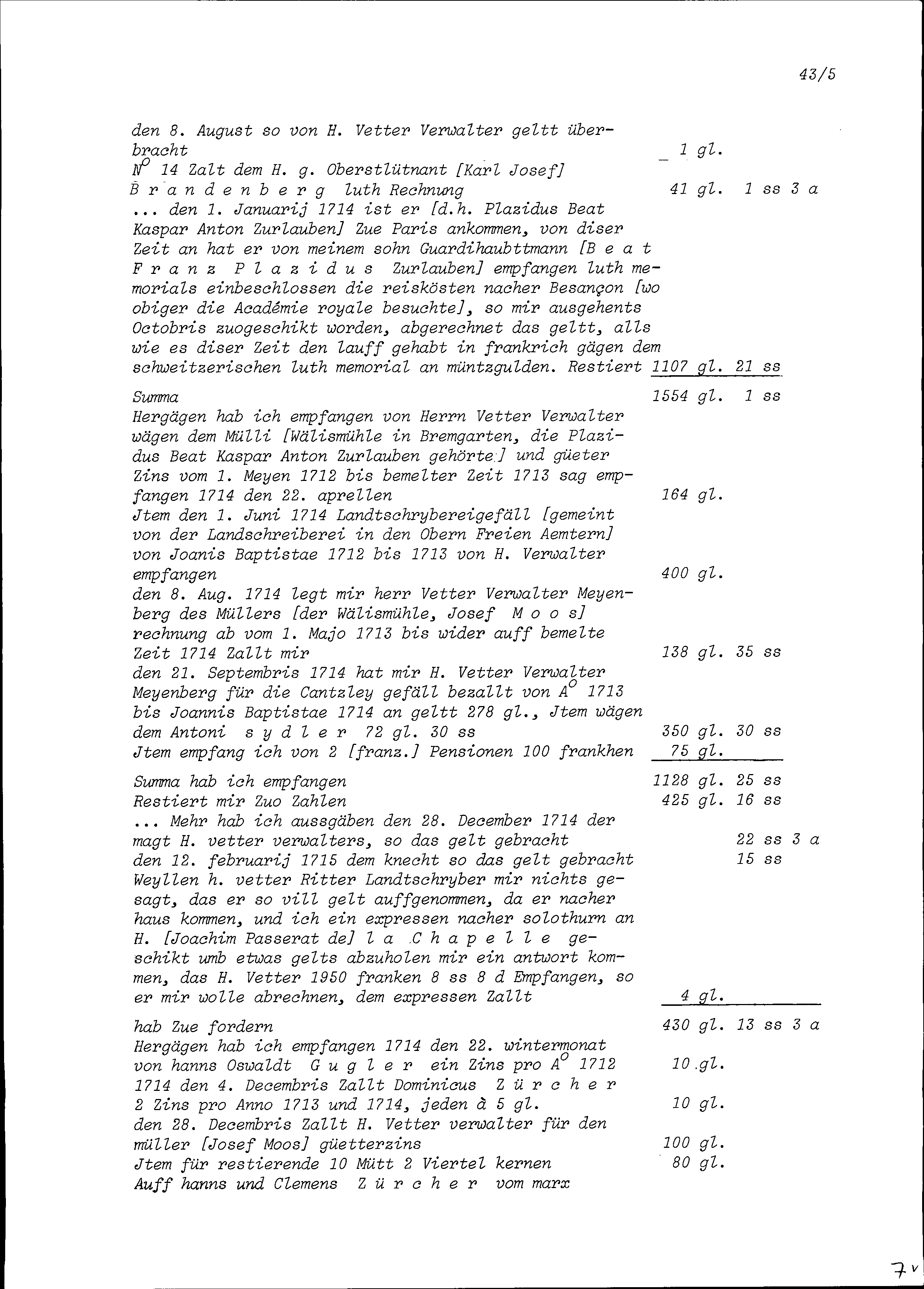 Abrechnung von Beat Jakob II. Zurlauben als Vormund von Plazidus Beat Kaspar Anton Zurlauben, seinem Neffen