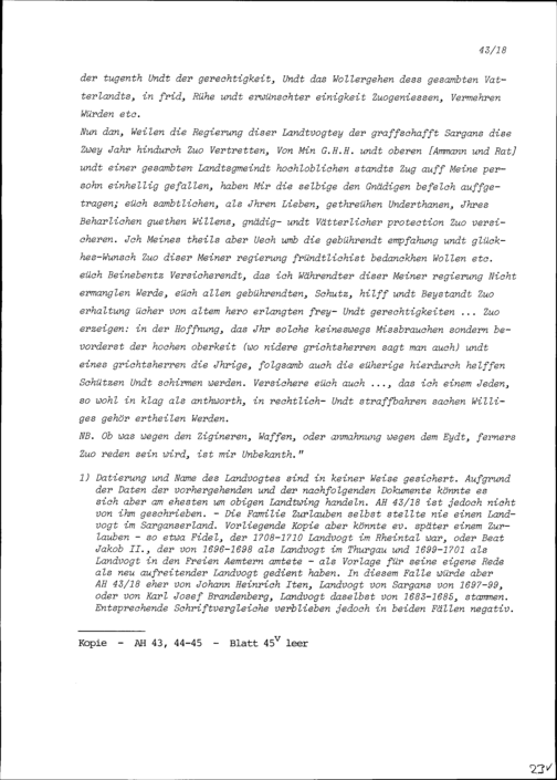 Ansprache von Johann Franz Landtwing, neuerwählter Landvogt im Sarganserland, anlässlich seines Aufritts