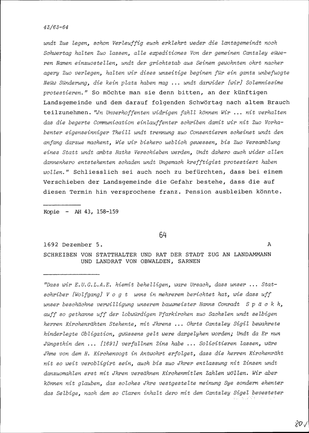 Schreiben des Statthalters und Rats der Stadt Zug an Landammann und Landrat von Obwalden, Sarnen