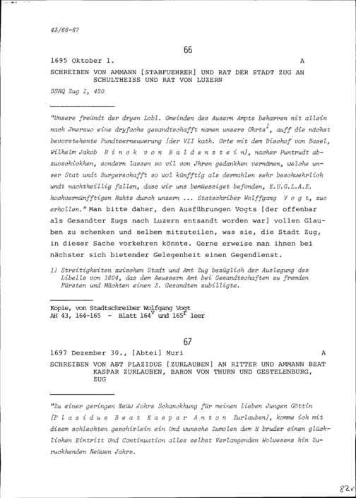 Schreiben des Ammanns (Stabführers) und Rats der Stadt Zug an Schultheiss und Rat...
