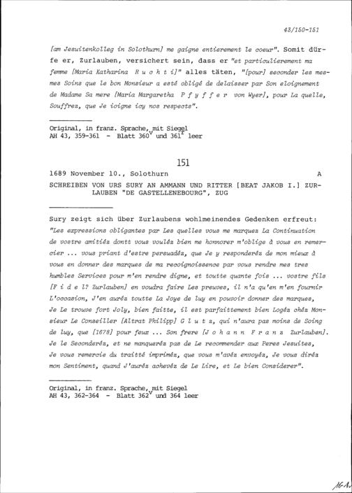 Schreiben von Urs Sury an Beat Jakob I. Zurlauben, Ammann, Zug