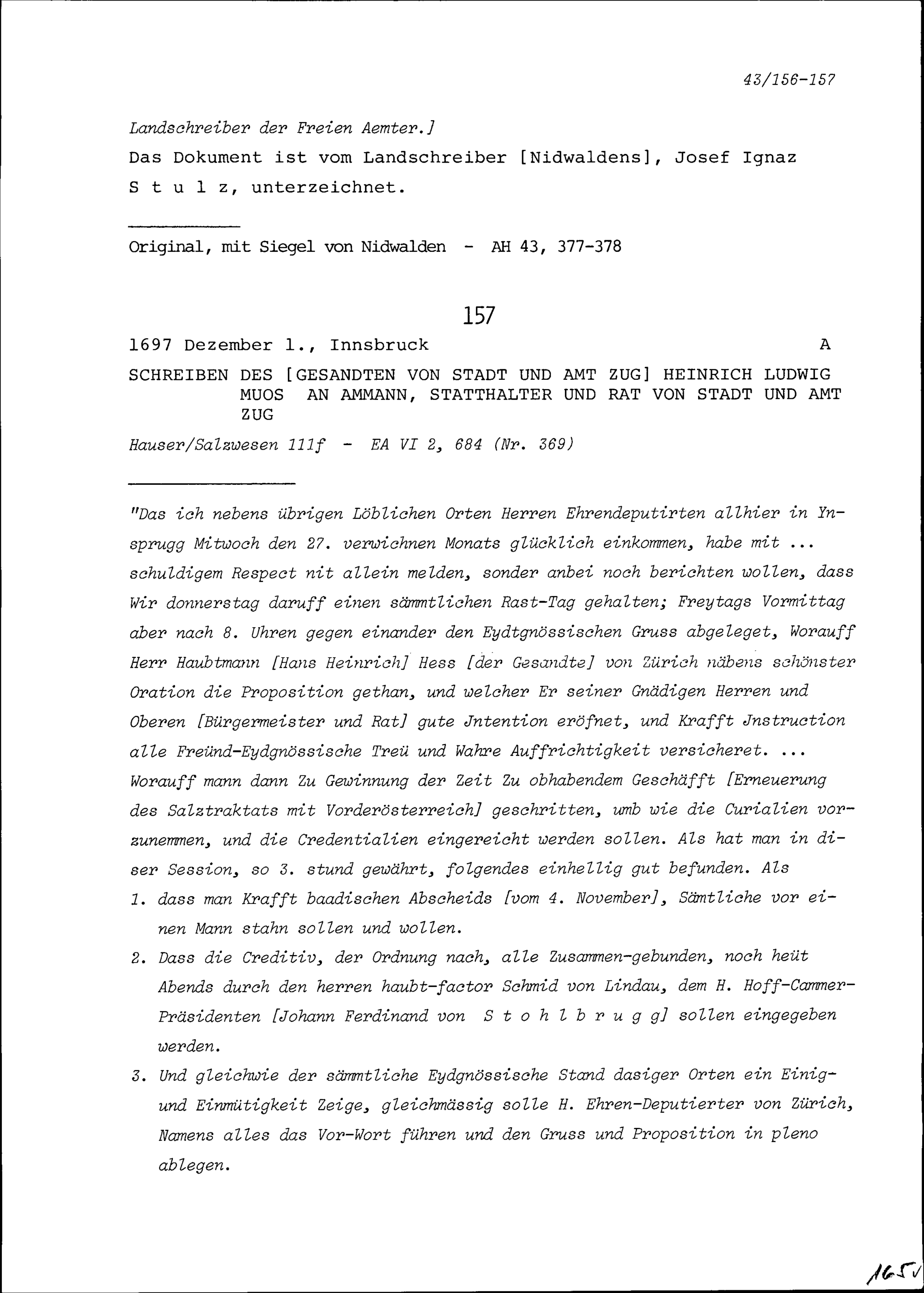 Schreiben von Heinrich Ludwig Muos, Gesandter von Stadt und Amt Zug, an Ammann, Statthalter und Rat von Stadt und Amt Zug