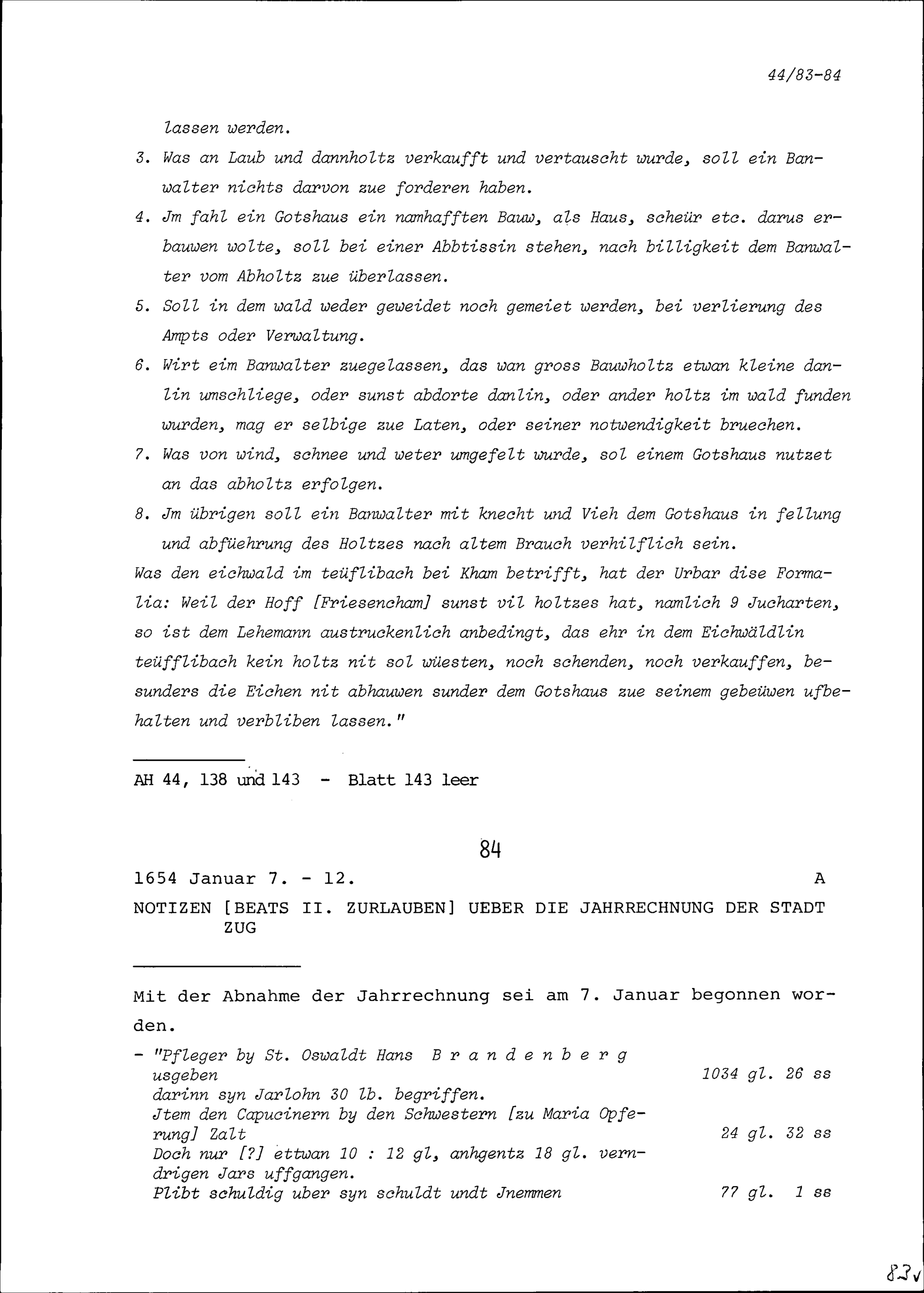 Notiz von Beat II. Zurlauben über die Jahrrechnung der Stadt Zug