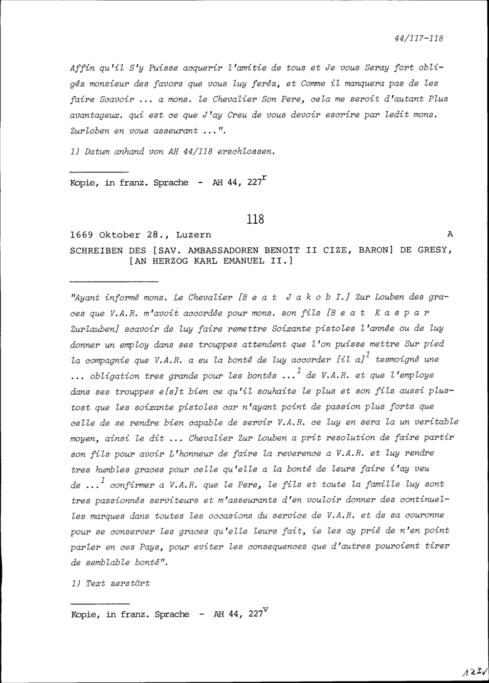 Schreiben von Benoît II. Cize, Baron de Grésy, Ambassador von Frankreich, an Karl Emanuel II., Herzog von Savoyen