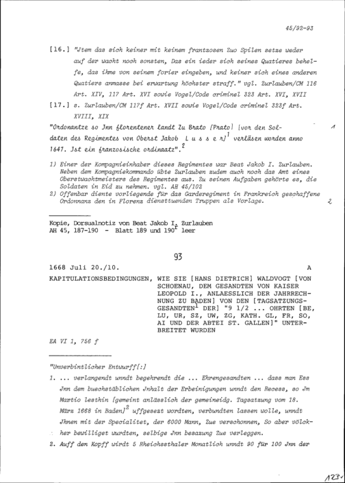 Kapitulationsbedingungen, wie sie Hans Dietrich Waldvogt von Schönau, dem Gesandten von Leopold I., Kaiser des Heiligen Römischen Reiches, anlässlich der Jahrrechnung in Baden von den Tagsatzungsgesandten der Neuneinhalb Orte Bern, Luzern, Uri, Schwyz, Unterwalden (Ob- und Nidwalden), Zug, Katholisch Glarus, Freiburg, Solothurn, Appenzell-Innerrhoden und der Abtei Sankt Gallen unterbreitet wurden