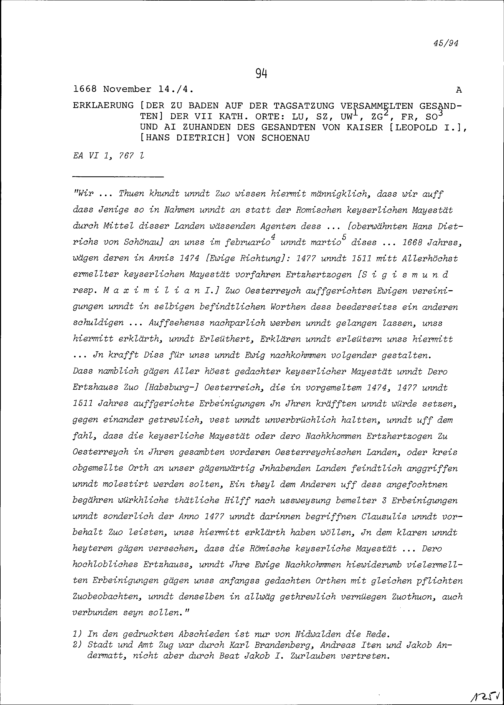 Erklärung der Tagsatzungsgesandten der Sieben Katholischen Orte Luzern, Schwyz, Unterwalden (Ob- und Nidwalden), Zug, Freiburg, Solothurn und Appenzell-Innerrhoden in Baden zuhanden von Hans Dietrich von Schönau, Gesandter von Leopold I., Kaiser des Heiligen Römischen Reiches