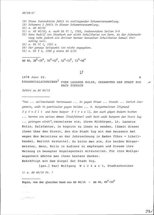 Kredenzialschreiben für Lazarus Kolin, Gesandter der Stadt Zug nach Zürich