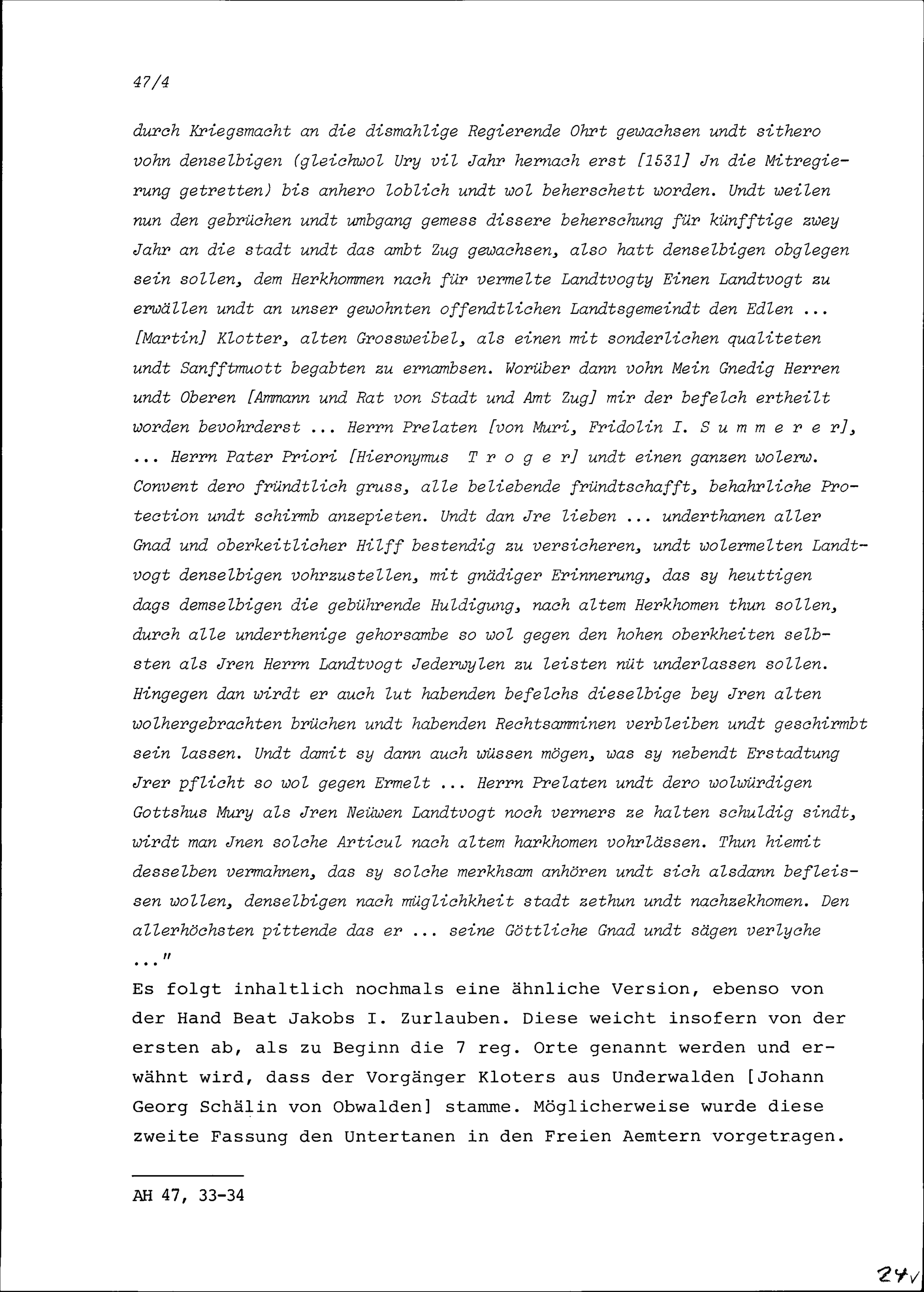 Amtseinführung von Martin Kloter, Landvogt der Freien Ämter, vorgenommen durch Beat...