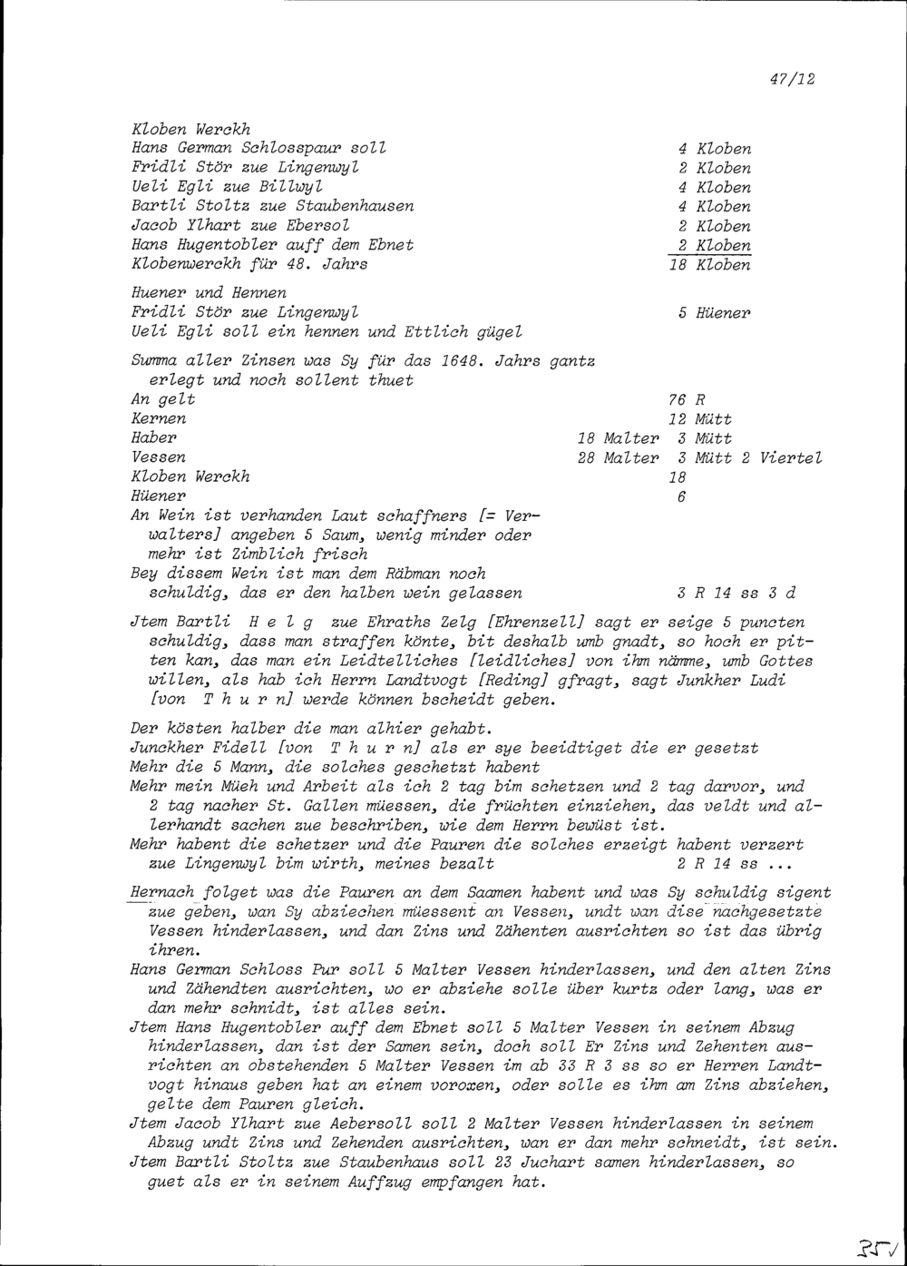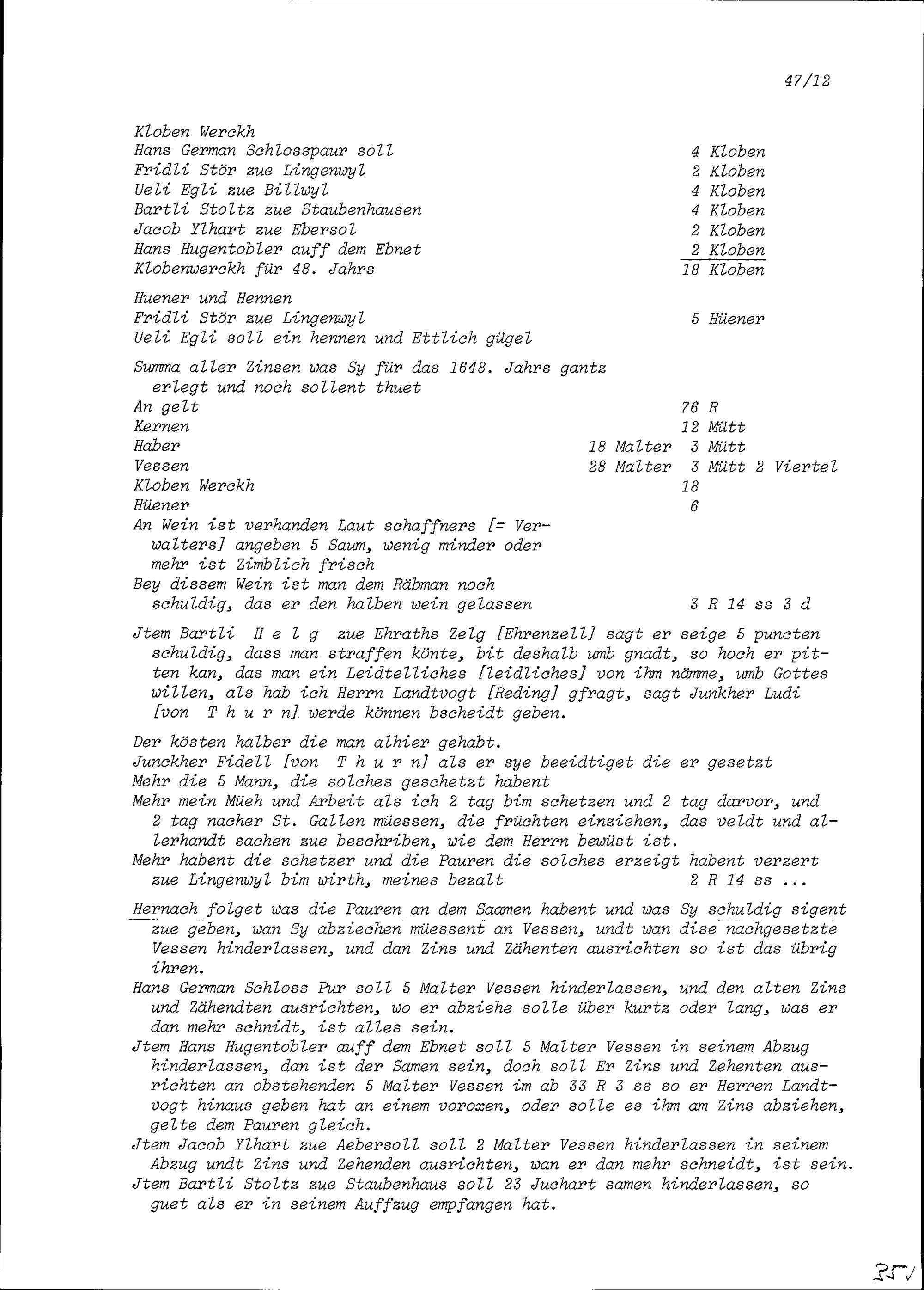 Rechnung von Jörg Gresser mit den Bauern der Herrschaft Glattburg, die von Johann Rudolf Reding, Landvogt im Toggenburg, Herr der Glattburg, am 16. Dezember gutgeheissen wurde
