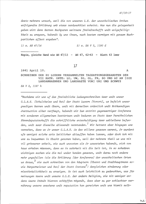 Schreiben der Tagsatzungsgesandten der Sieben Katholischen Orte Luzern, Unterwalden...