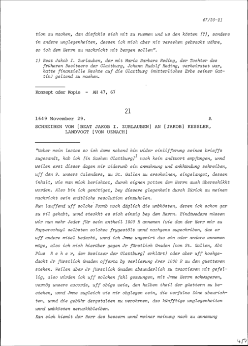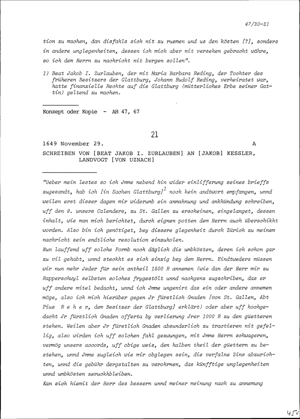 Schreiben von Beat Jakob I. Zurlauben an Jakob Kessler, Landvogt von Uznach