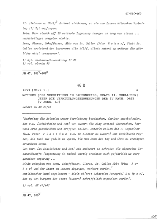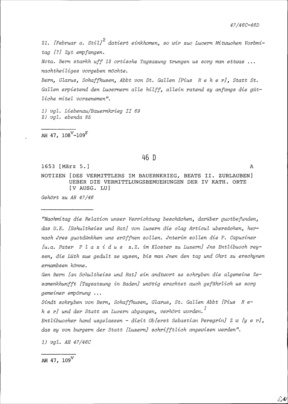Notiz von Beat II. Zurlauben, Vermittler im Bauernkrieg über die Vermittlungsbemühungen...