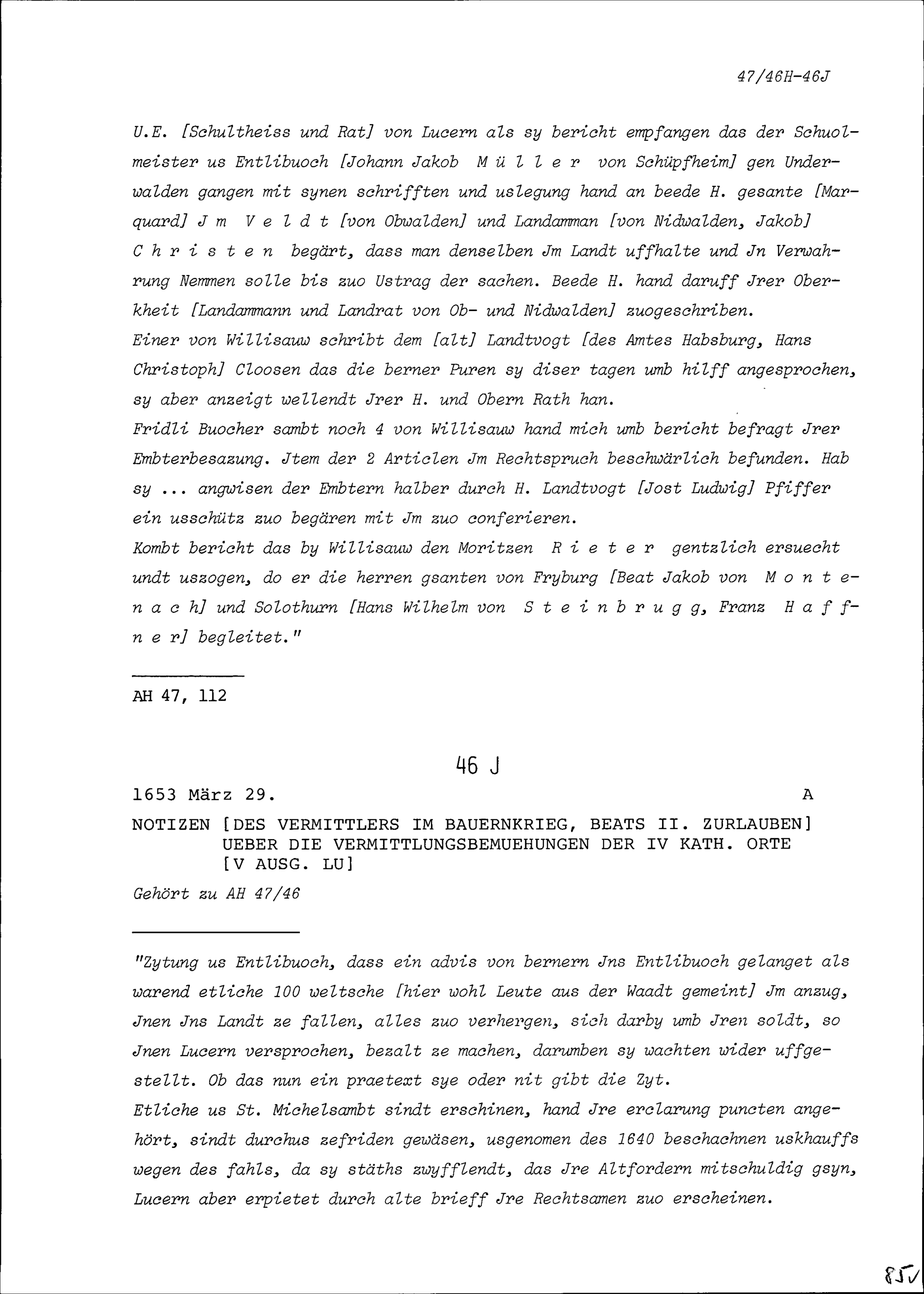 Notiz von Beat II. Zurlauben, Vermittler im Bauernkrieg über die Vermittlungsbemühungen der Vier Katholischen Orte